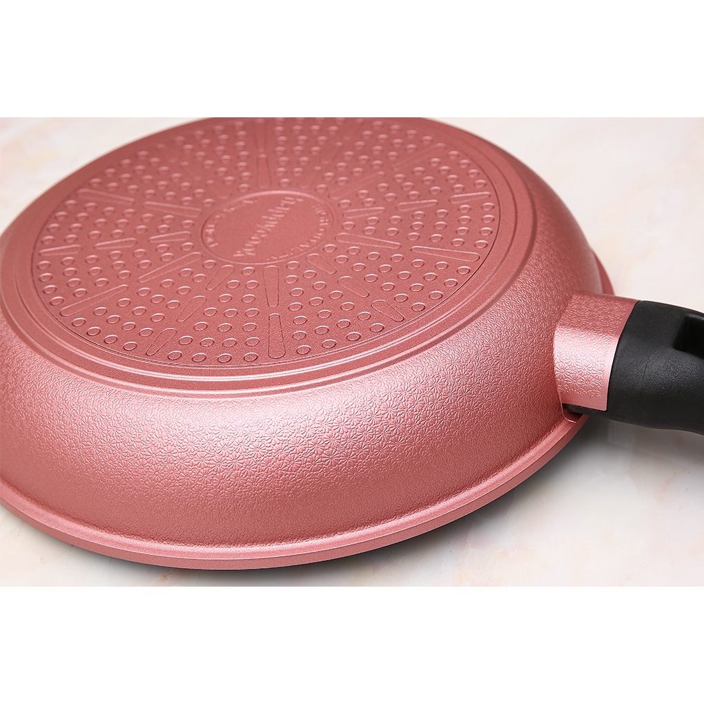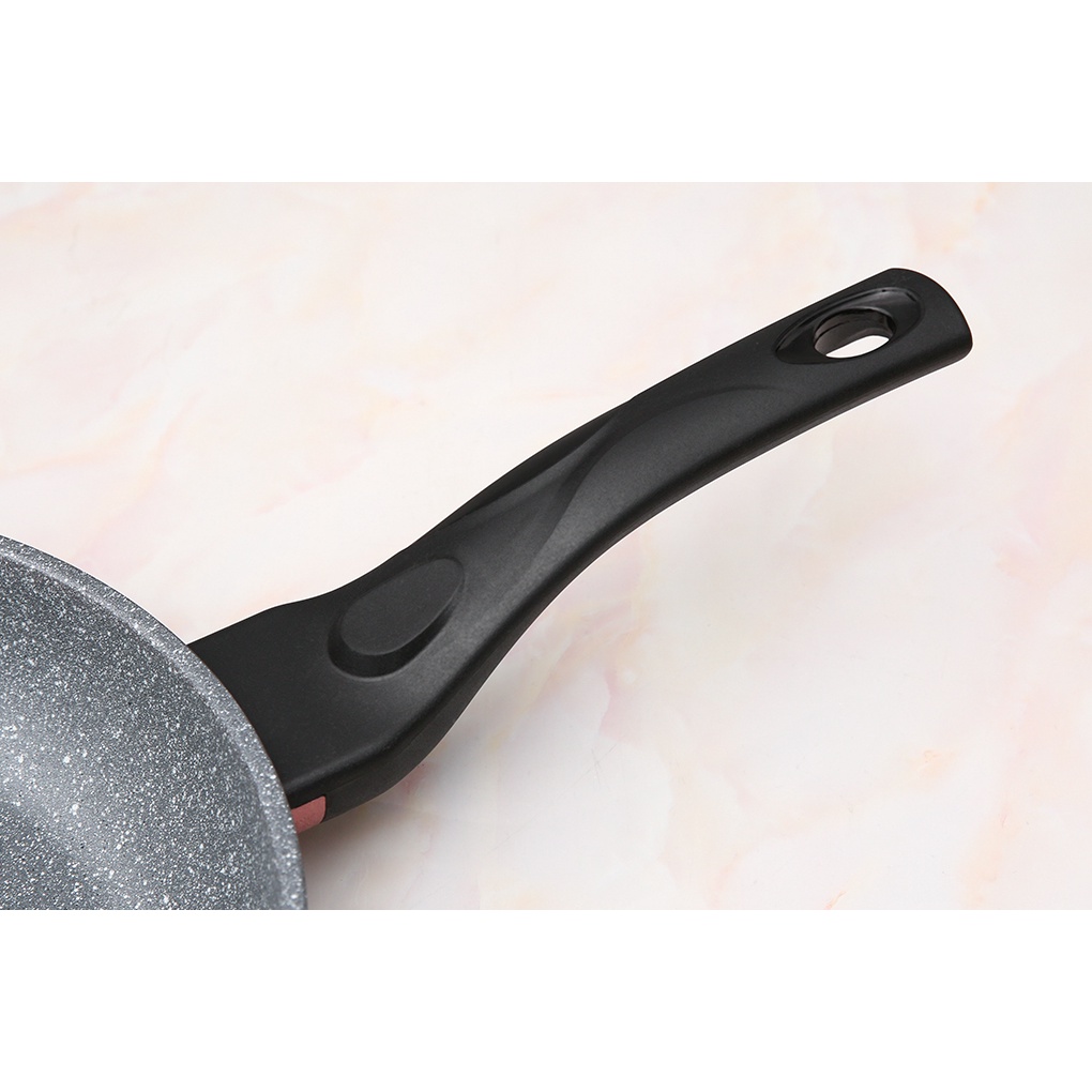 •Làm bằng nhôm đúc dày 1.562 mm tráng lớp chống dính vân đá bóng sáng, nấu ăn an toàn, ít tốn dầu mỡ, tiện chùi rửa