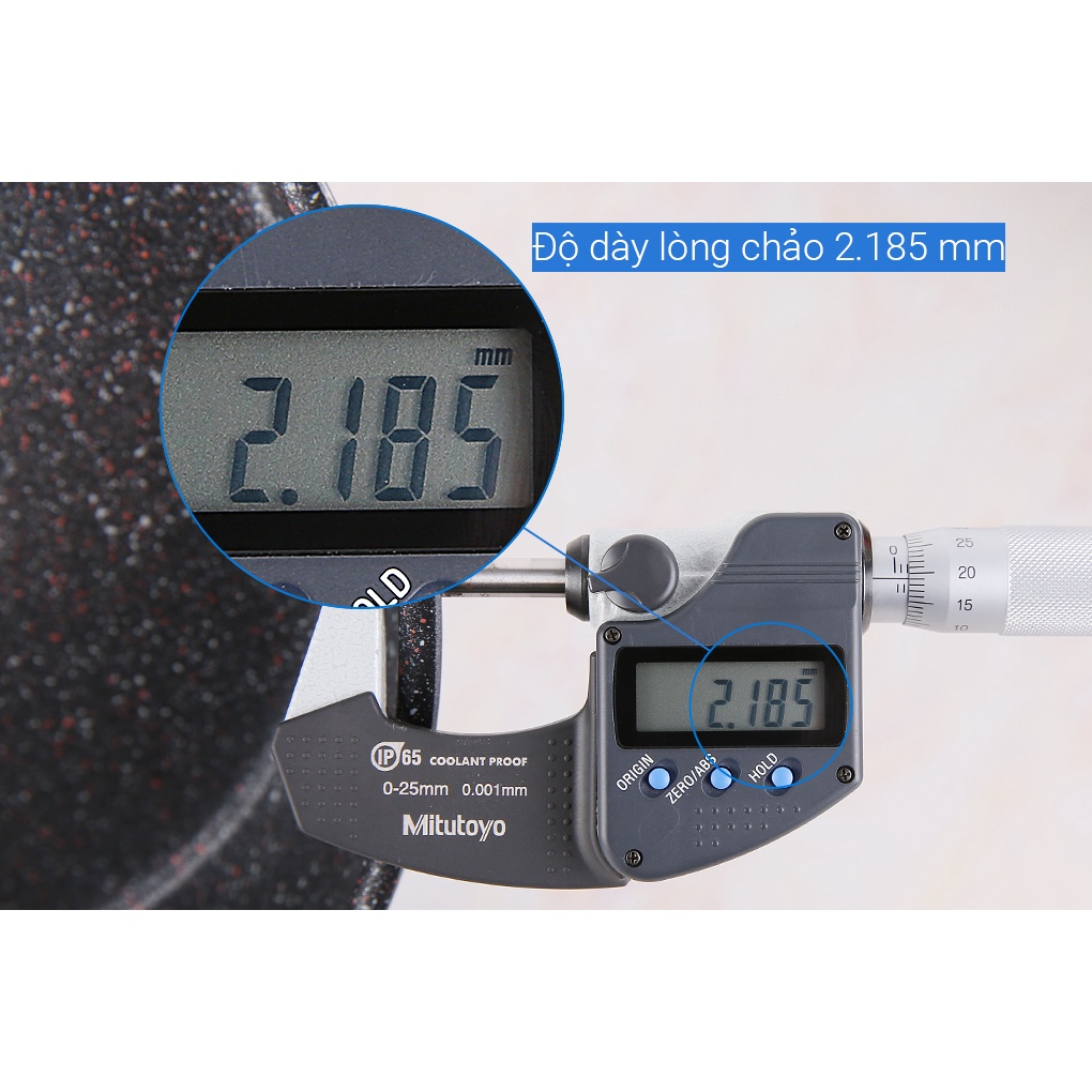 •Chất liệu hợp kim nhôm dày 2.185 mm bền bỉ, giữ ấm tốt. Bề mặt là lớp chống dính vân đá phủ sơn Teflon chịu mức nhiệt tối đa 400 °C hạn chế cháy dính thực phẩm, tiện vệ sinh. Khối lượng chảo 0.8 kg, cầm nắm thoải mái, dễ dàng di chuyển.