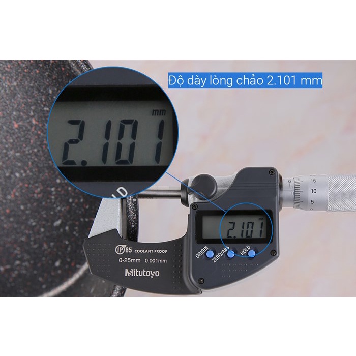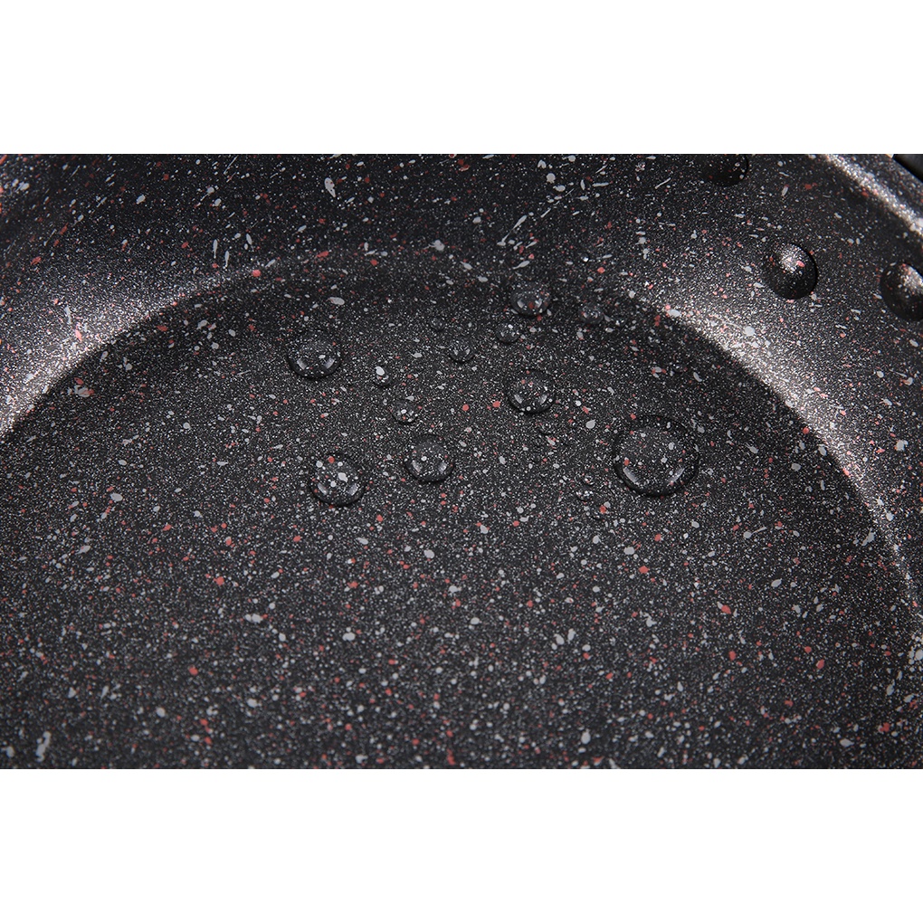 •Làm từ hợp kim nhôm dày 2.101 mm bền bỉ, giữ ấm tốt. Bề mặt là lớp chống dính vân đá phủ sơn Teflon chịu mức nhiệt tối đa 400 °C hạn chế cháy dính thực phẩm, tiện vệ sinh. Khối lượng chảo 0.64 kg, dễ dàng cầm nắm và di chuyển.