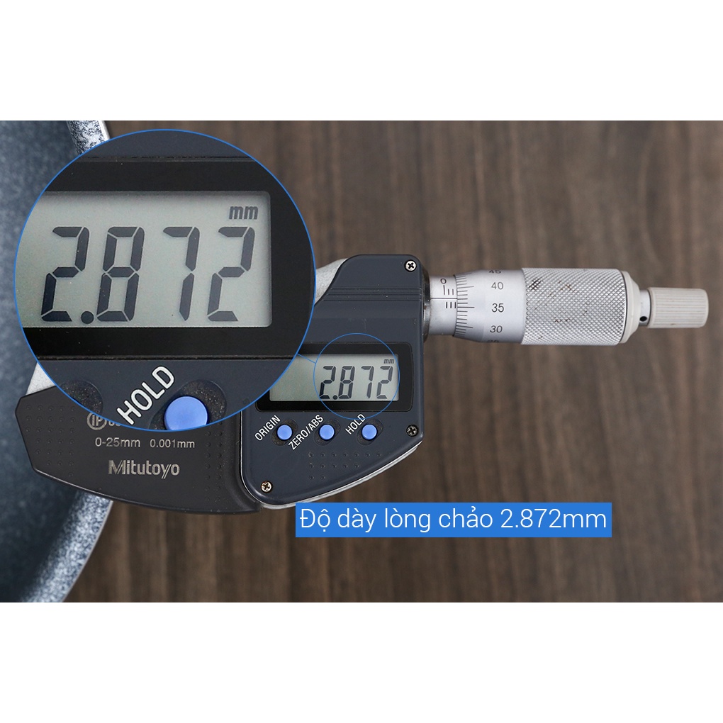 •Độ dày 2.872 mm, chảo có khả năng giữ nhiệt tốt, độ bền cao. Khối lượng chảo lên đến 1.02 kg cầm chắc tay, bền bỉ.