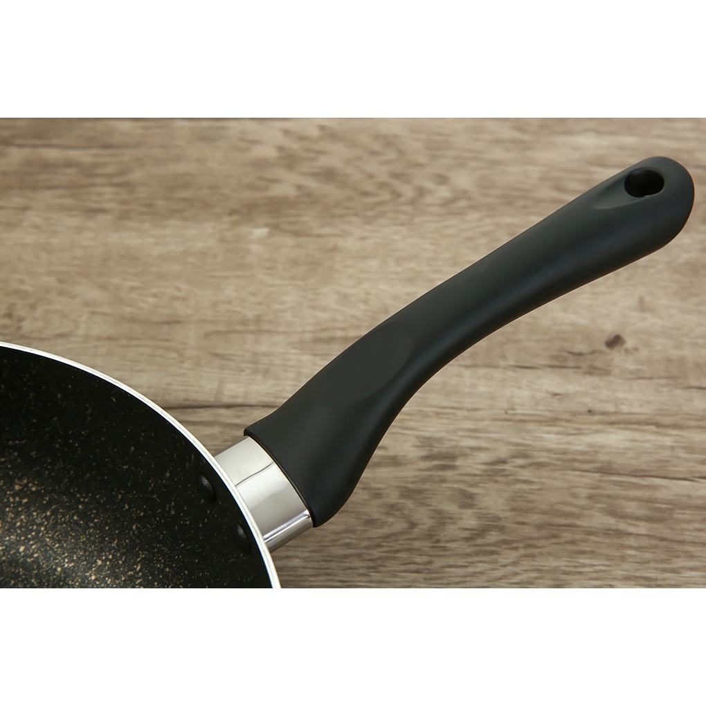 •Chảo chống dính có tay cầm bằng nhựa cách nhiệt Bakelite, di chuyển chảo xuống khỏi bếp không lo nóng tay. Tay cầm được gắn chắc chắn vào thân chảo, yên tâm khi thao tác. Cuối tay cầm có lỗ treo móc, thuận tiện khi bảo quản.
