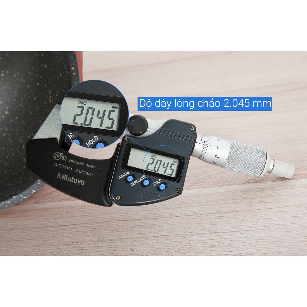 •Thành chảo bằng nhôm độ dày 2.045 mm giữ ấm lâu, chống móp méo tốt