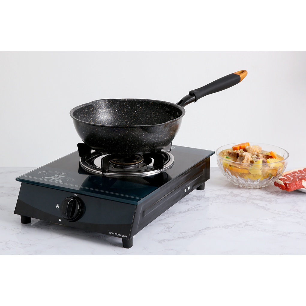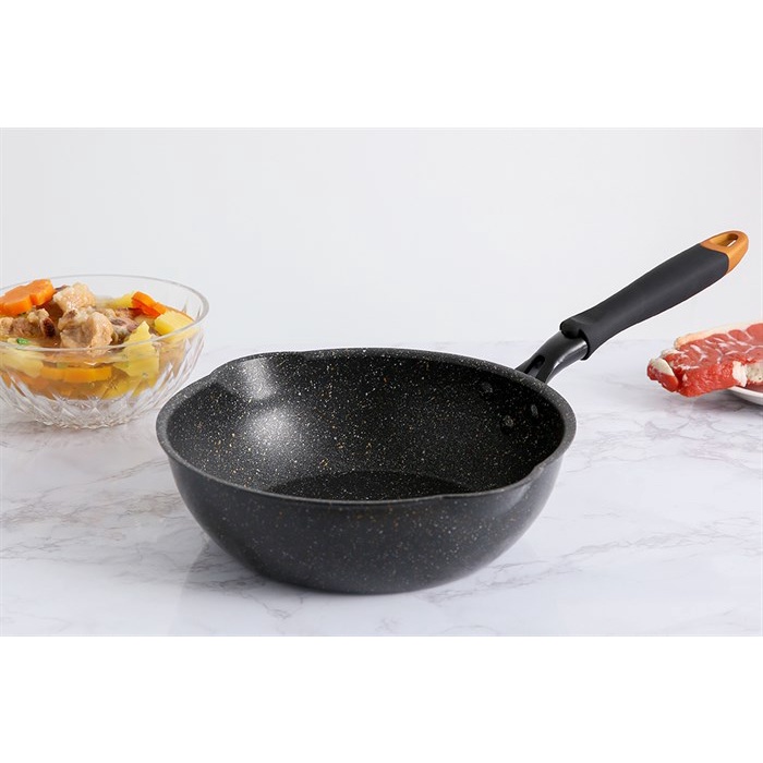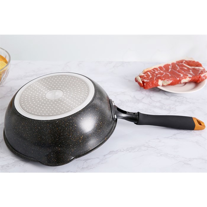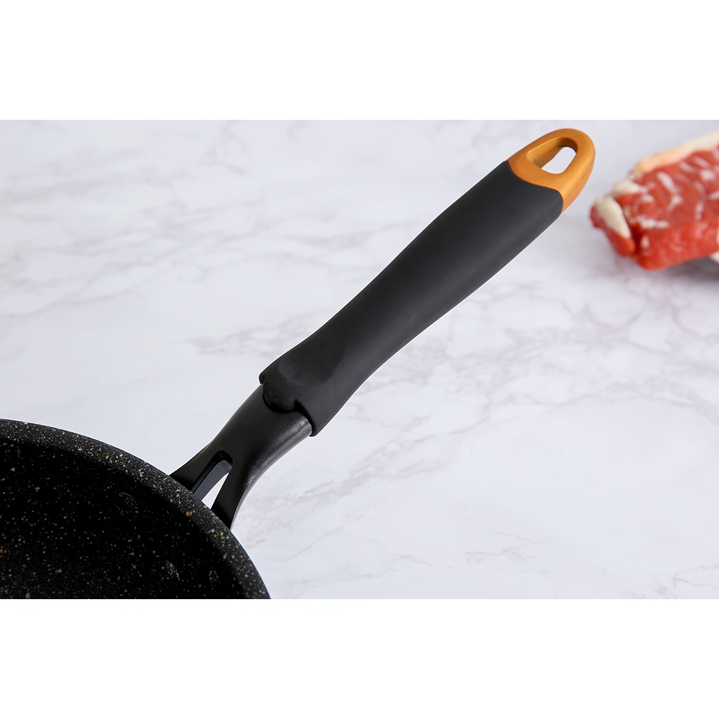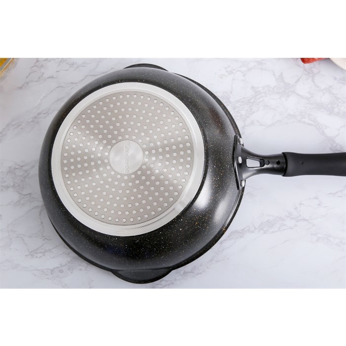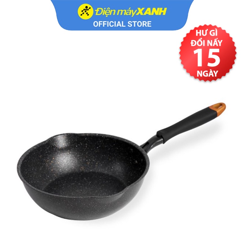 •Chảo bằng hợp kim nhôm 3003 phủ lớp chống dính vân đá phủ sơn PTFE chịu được mức nhiệt tối đa 400 °C. An toàn sức khỏe cho người dùng, chiên, xào ngon, dễ vệ sinh sau khi sử dụng. Chảo có khối lượng 0.67 kg, cầm nắm và di chuyển tiện lợi khi nấu ăn.