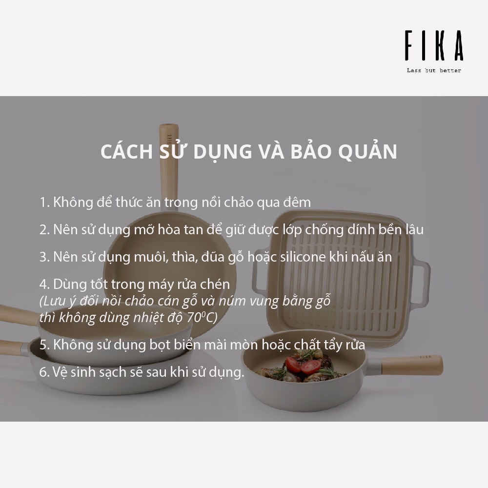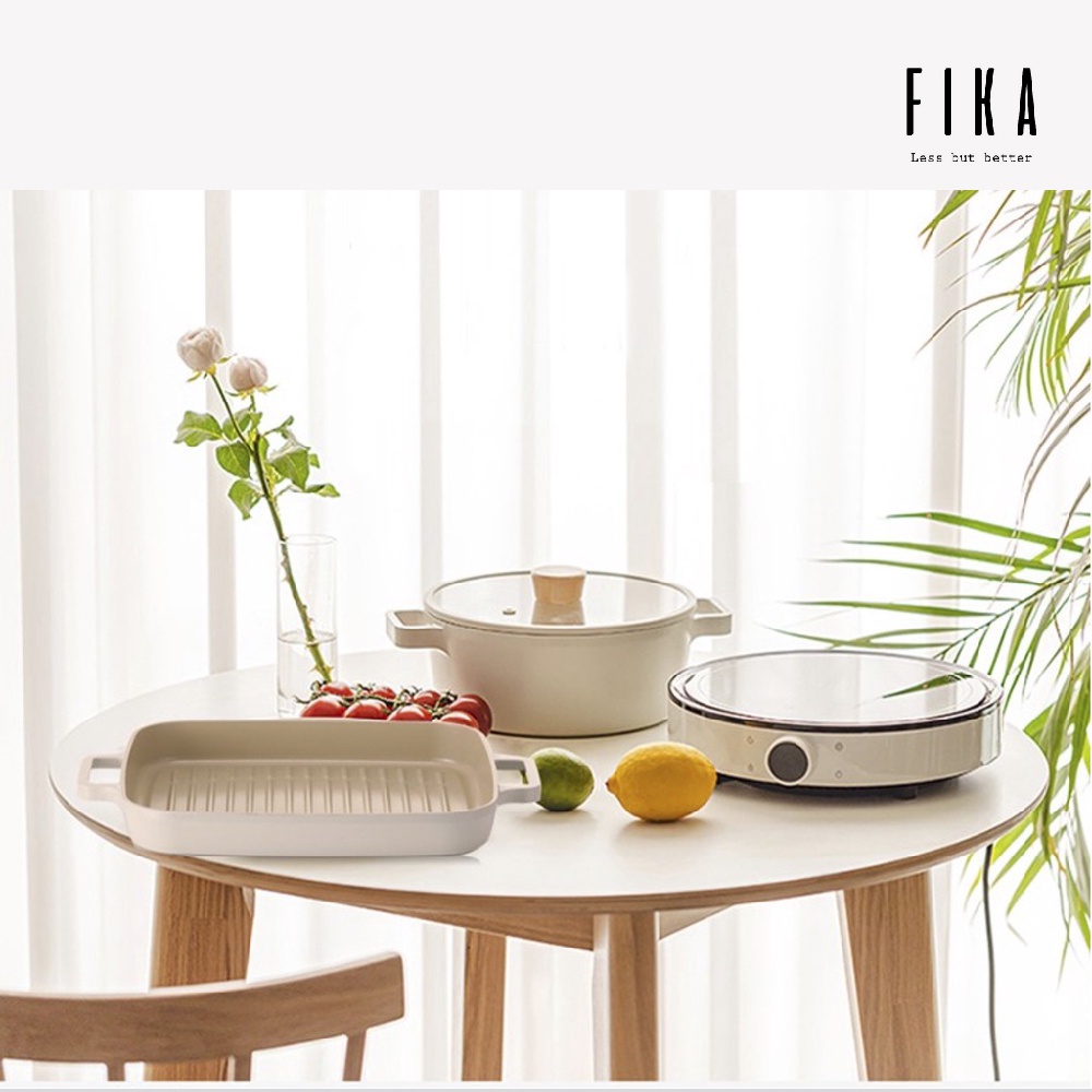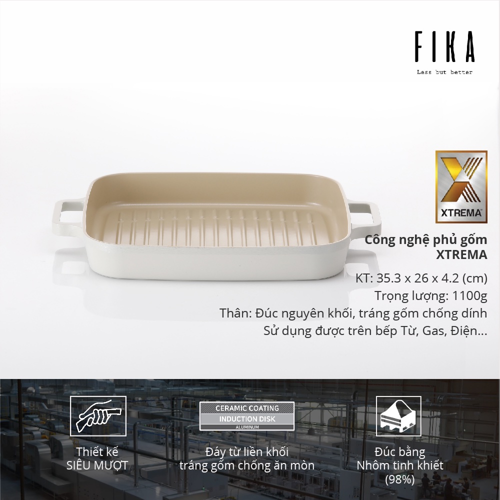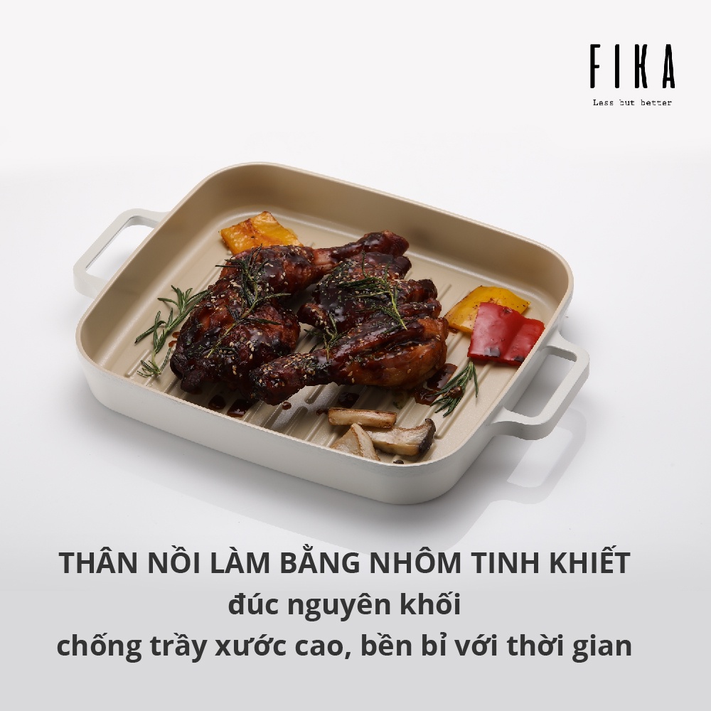 Chảo nướng phủ gốm chống dính FIKA được làm bằng nhôm tinh khiết đúc nguyên khối nên khả năng tản nhiệt tốt, nóng đều mọi vị trí trong chảo cho thực phẩm chín đều, giữ nguyên được hương vị thực phẩm và giữ nhiệt tối đa trong quá trình sử dụng. Đáy từ giúp sử dụng tốt trên bếp từ, bếp hồng ngoại và bếp gas.