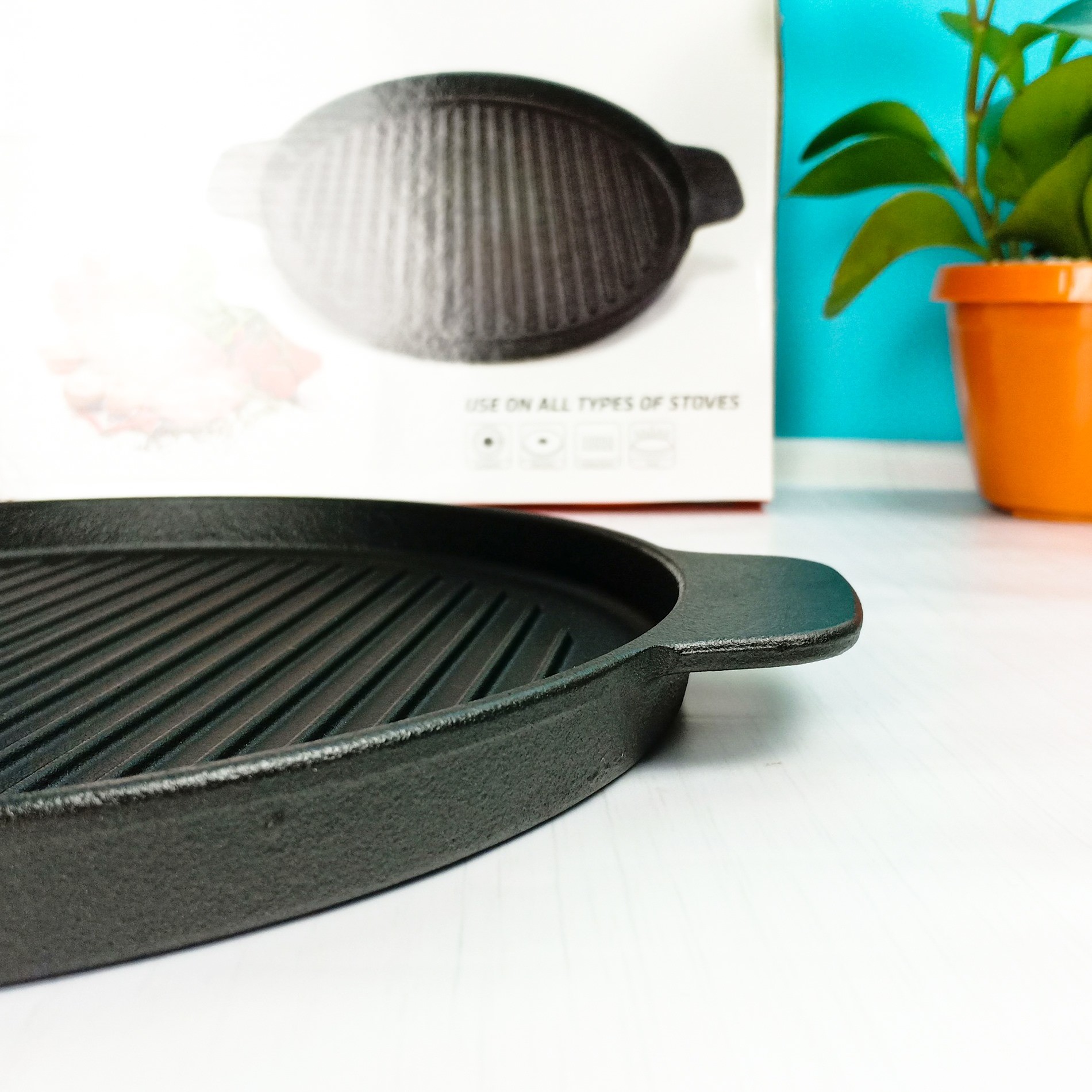 Chảo nướng bằng gang, dùng trên mọi loại bếp: bếp từ, bếp hồng ngoại, bếp gas, cồn, than củi, cho vào lò nướng dung tích lớn,...