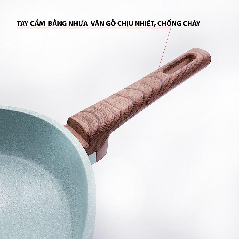 ✅ Cán chảo sử dụng nguyên liệu tổng hợp chống nóng,chịu được ảnh hưởng của lửa tới cán chịu được nhiệt độ lên đến 180 độ C và cách nhiệt tuyệt đối, Cán vân gỗ tăng độ sang trọng của sản phẩm