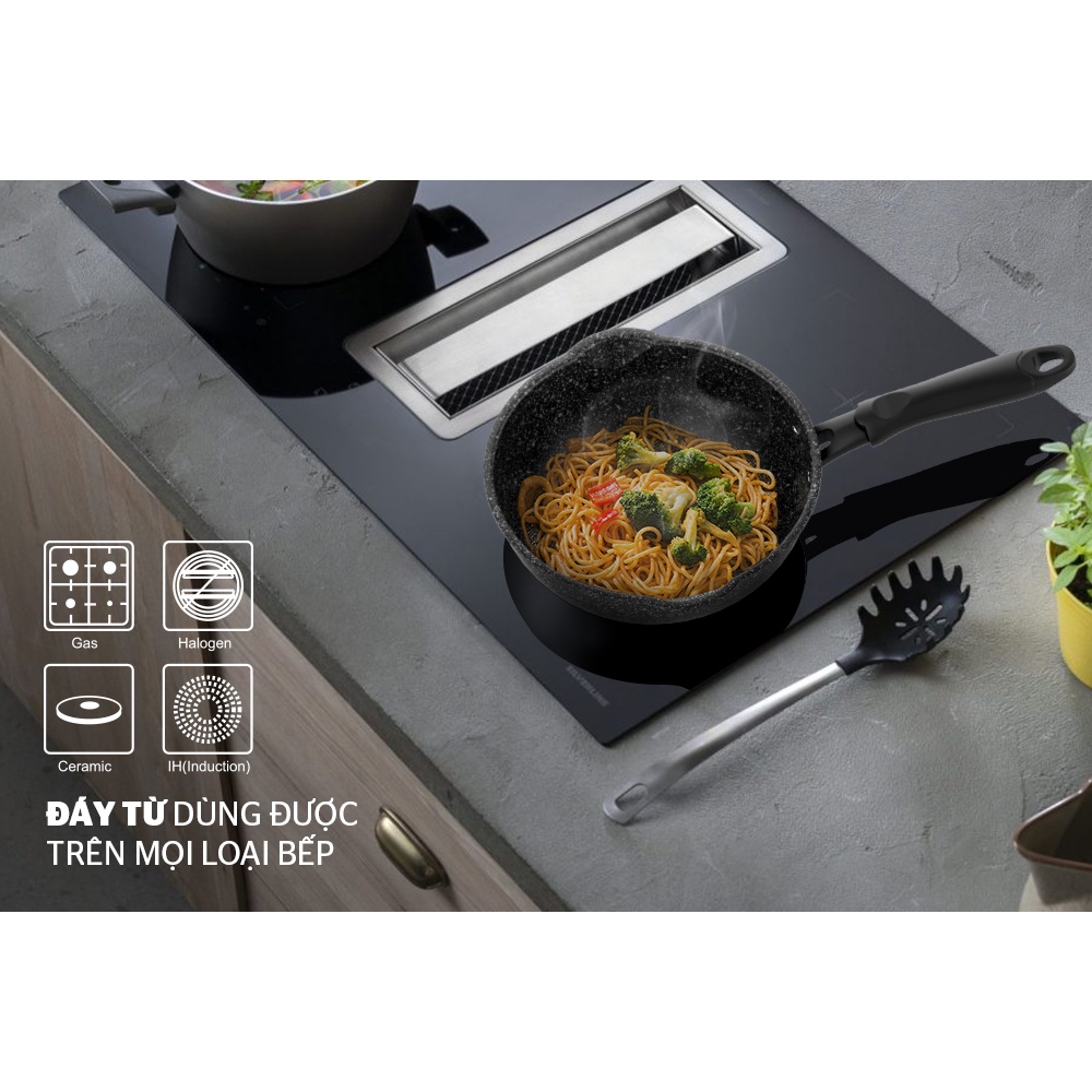 Sản phẩm được làm từ hợp kim nhôm nguyên chất cao cấp, sử dụng công nghệ sản xuất Hàn Quốc đạt tới sự bền chắc tuyệt đối. Lớp chống dính vân đá phủ trong lòng chảo giúp bạn chế trường hợp trầy xước, bám bẩn, đổi màu… cho sản phẩm luôn như mới.