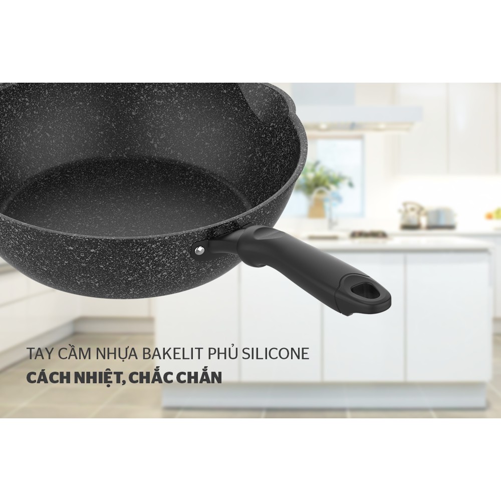 Lòng chảo được phủ 5 lớp chống dính Whitford (USA) cao cấp với lớp vân đá sang trọng, vừa an toàn cho sức khỏe, vừa chống dính cực tốt. Lớp chống dính này hoàn toàn không chứa PFOA, không phản ứng với thức ăn nên an toàn tuyệt đối cho sức khỏe.