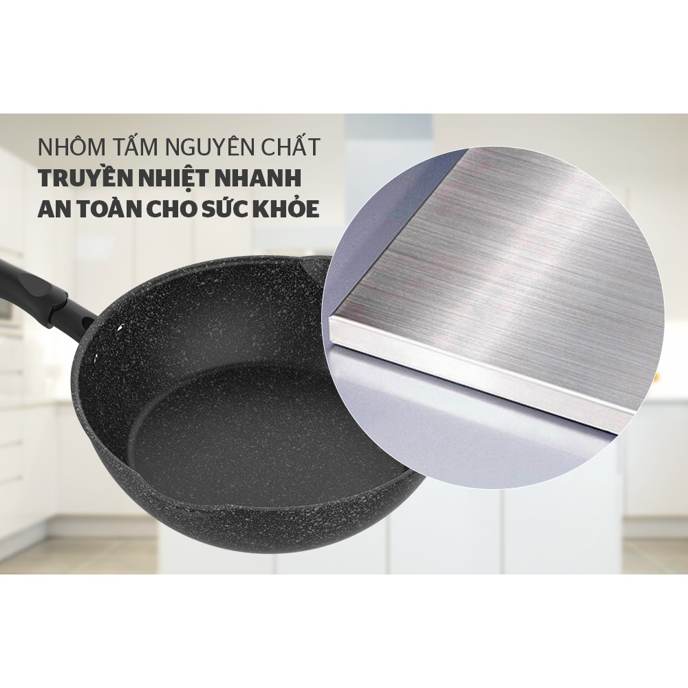 Sản phẩm được làm từ hợp kim nhôm nguyên chất cao cấp, sử dụng công nghệ sản xuất Hàn Quốc đạt tới sự bền chắc tuyệt đối. Lớp chống dính vân đá phủ trong lòng chảo giúp bạn chế trường hợp trầy xước, bám bẩn, đổi màu… cho sản phẩm luôn như mới.