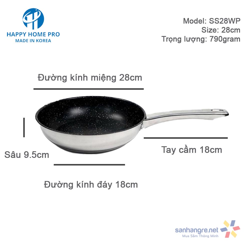 Giới thiệu Chảo sâu lòng chống dính Inox 304 Happy Home Pro Hàn Quốc 3 lớp đáy từ size 28cm