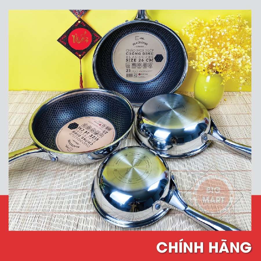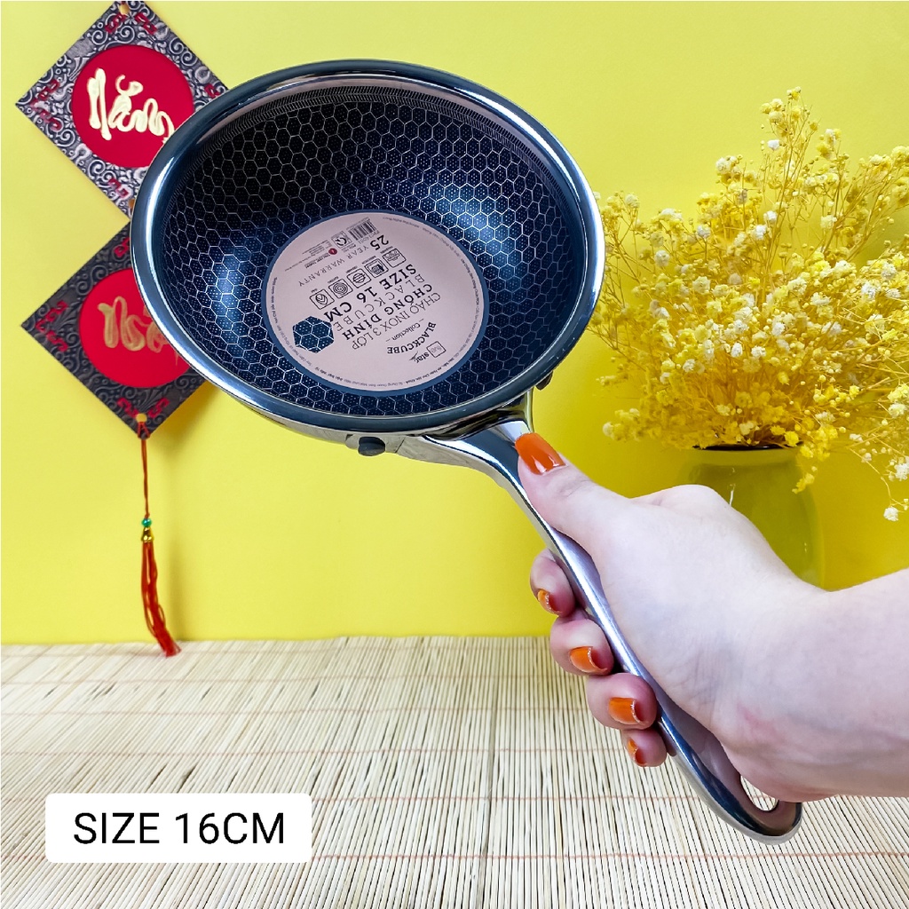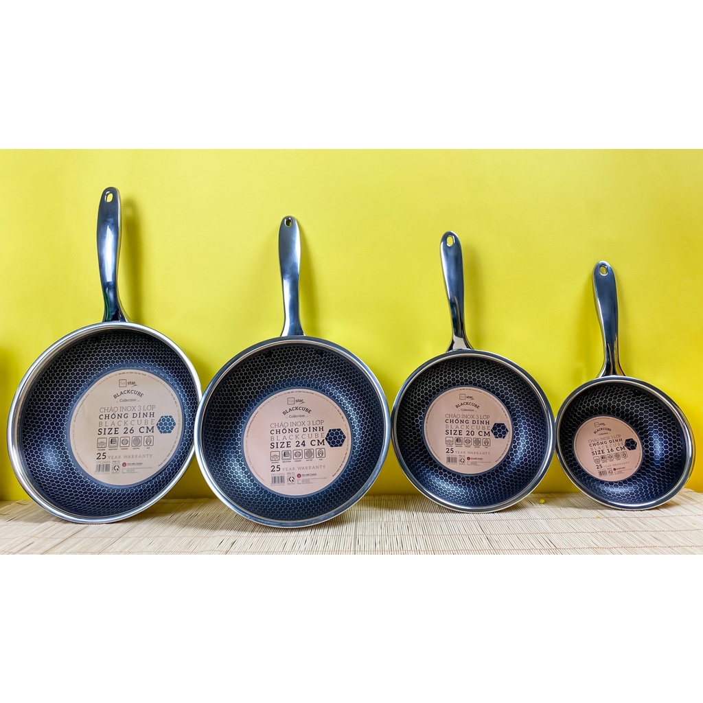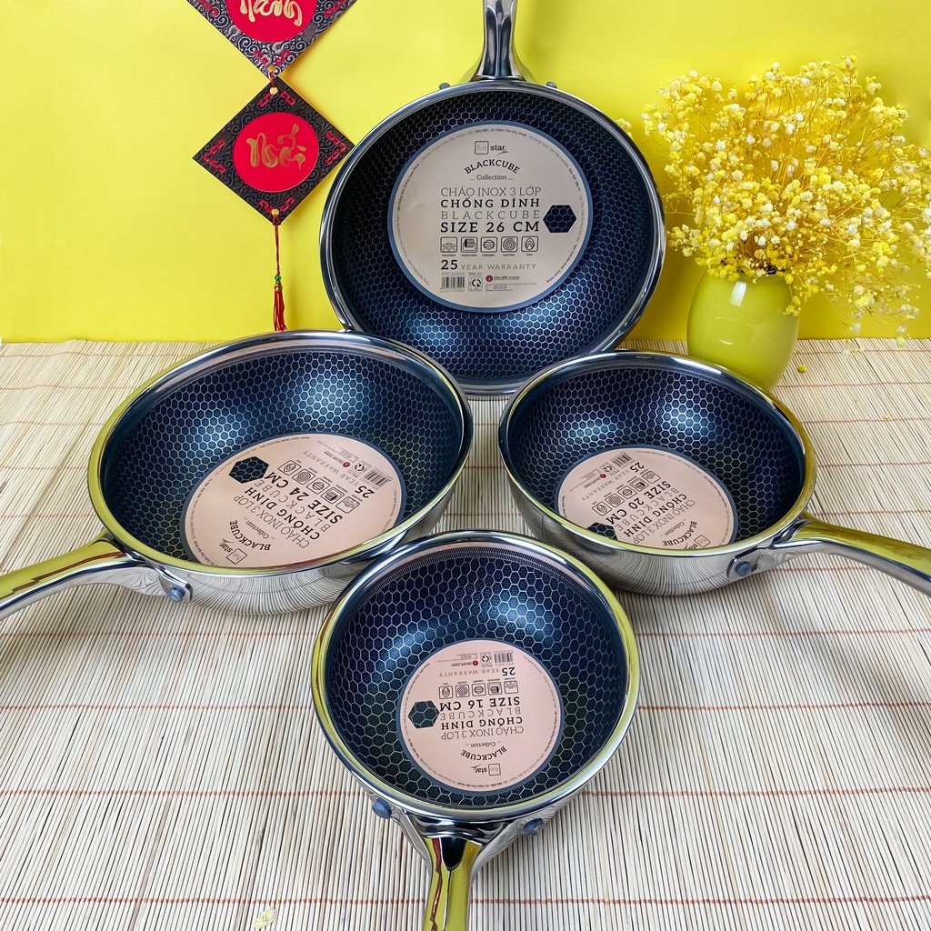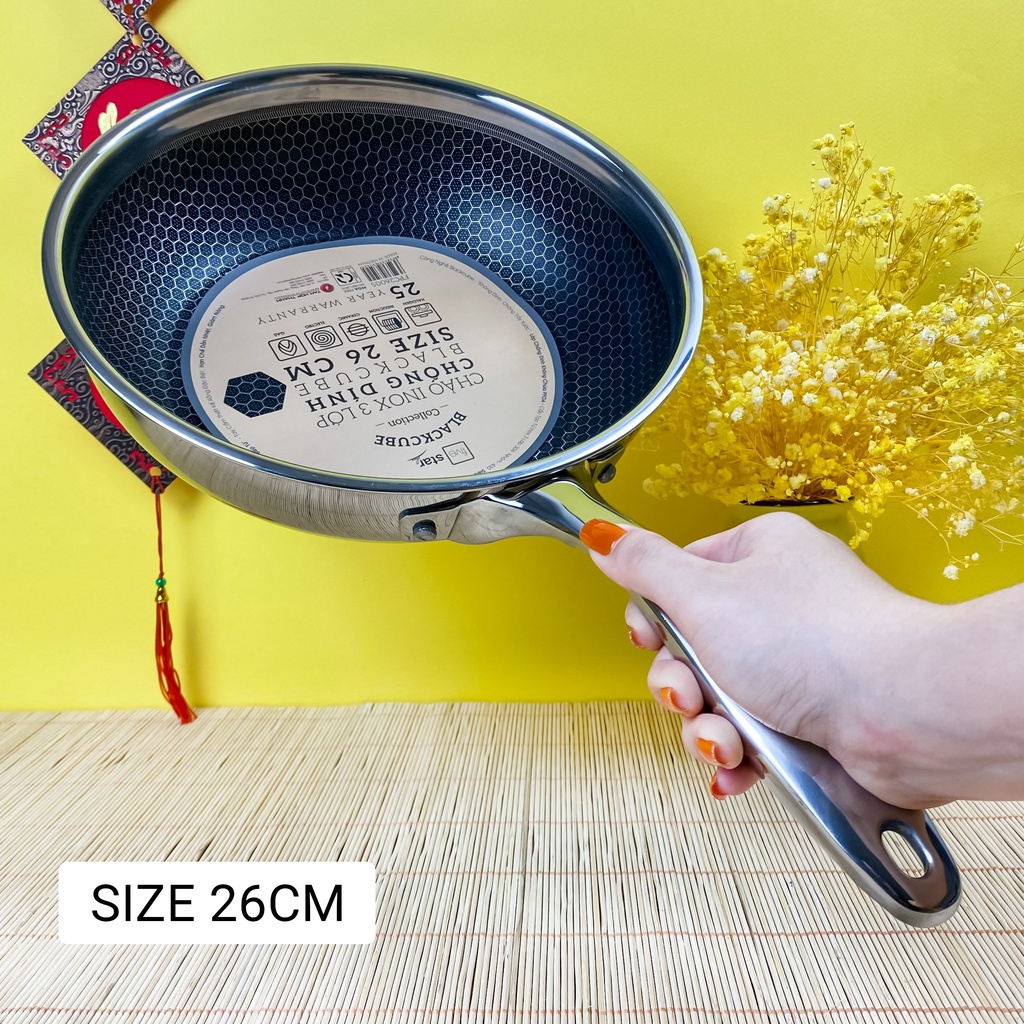 Em về chảo tổ ong black cube vốn làm điên đảo các chị em Yêu Bếp, vì vẻ đẹp sang chảnh khó cưỡng, khả năng chống xước siêu đỉnh. Công nghệ vân tổ ong làm dòng black cube luôn cực kỳ đắt đỏ. Vậy nên FiveStar cho ra mắt dòng chảo này làm bao chị em mê tít, chảo siêu đẹp mà giá cực hợp lý ạ!👉👉 Cầm trên tay mà thấy em nào cũng cưng xỉu luôn. Chiếc chảo này cực kỳ phù hợp để chiên ngập dầu, nấu kho quẹt, size to hơn thì để rang xào thoải mái. Đây là dạng chống dính khoan khắc, xen kẽ giữa inox và chống dính. Lớp chống dính chìm xuống, phần inox nổi lên. Nên khi dùng xẻng kim loại để lật, đảo thì không ảnh hưởng đến chống dính. Không bị bong tróc chống dính ạ!