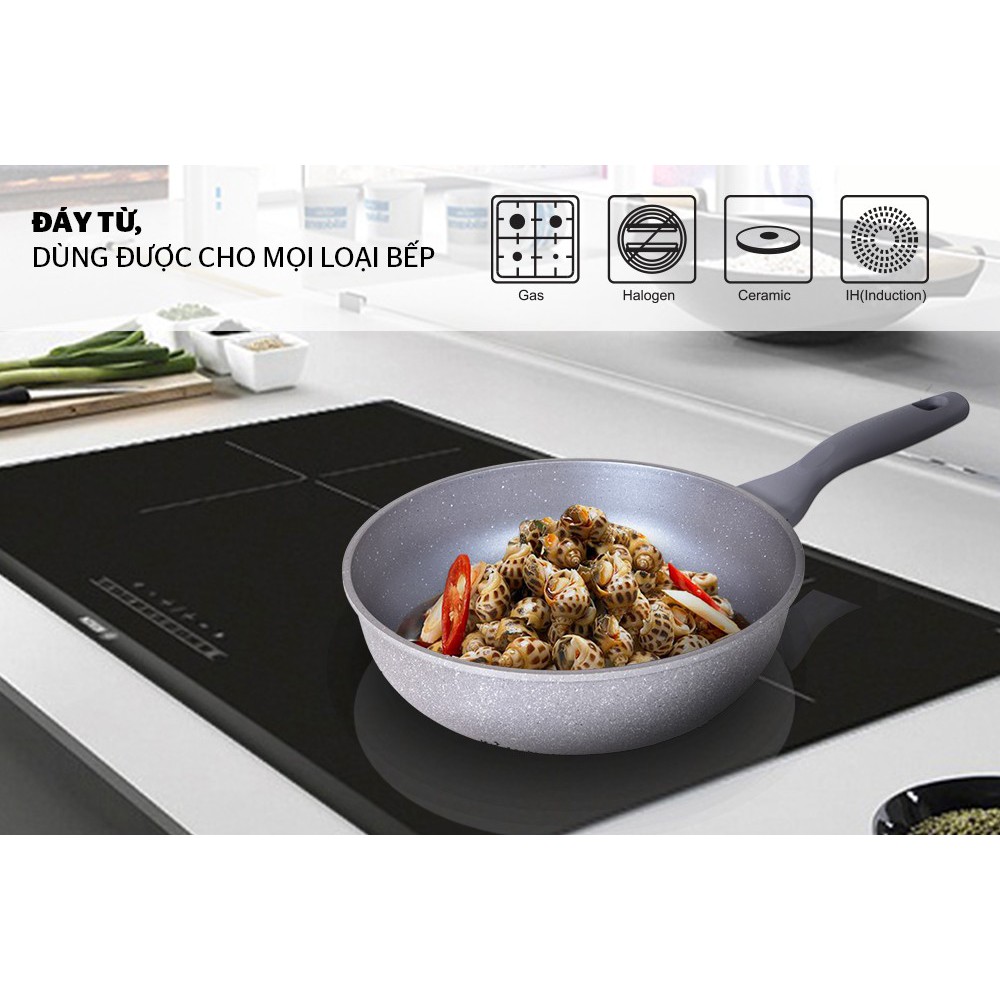 Chảo được tích hợp đáy từ, dễ dàng linh hoạt trên đa dạng các loại bếp, bao gồm bếp từ, bếp hồng ngoại, bếp gas,