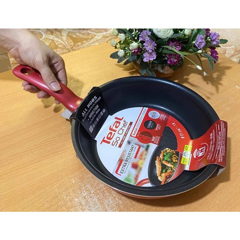 - Chảo Tefal So Chef với 3 lớp chống dính Titanium bền bỉ, cao cấp chống trầy xước, hoàn toàn không chứa PFOA, không tạo ra bất kỳ phản ứng hóa học nào khi tiếp xúc thực phẩm.