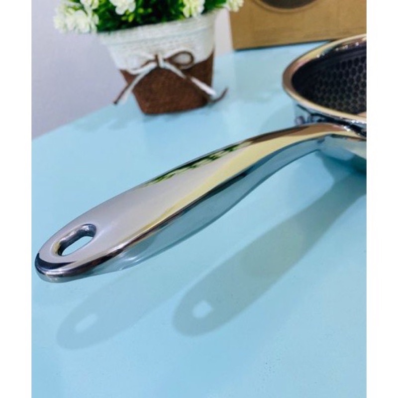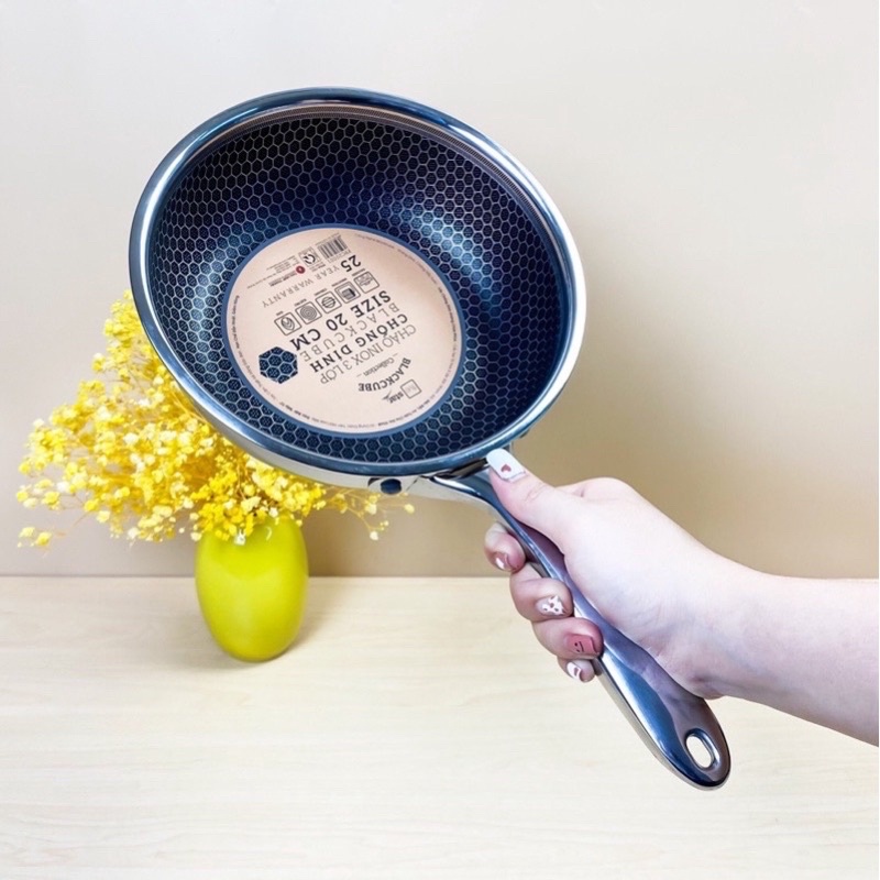 Cầm trên tay mà thấy em nào cũng cưng xỉu luôn. Chiếc chảo này cực kỳ phù hợp để chiên ngập dầu, nấu kho quẹt, size to hơn thì để rang xào thoải mái. Đây là dạng chống dính khoan khắc, xen kẽ giữa inox và chống dính. Lớp chống dính chìm xuống, phần inox nổi lên. Nên khi dùng xẻng kim loại để lật, đảo thì không ảnh hưởng đến chống dính. Không bị bong tróc chống dính ạ!