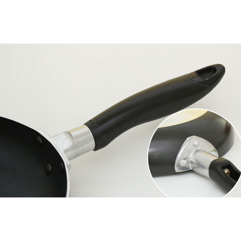 Tay cầm được bắt vít chắc chắn vào thân chảo, đảm bảo an toàn trong quá trình sử dụng, nâng nhấc, di chuyển. Cán cầm bằng nhựa bakelite chịu nhiệt siêu bền có độ dài vừa phải, chống bỏng, hạn chế trơn trượt.