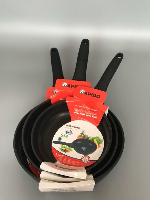 Chảo Ferroli- Rapido chuẩn Đức, Size 28,24,20 Cm, độ sâu lòng vừa phải, lòng chảo phẳng.- Vật liệu chảo: Khác với những loại chảo từ sản xuất theo công nghệ dập khuôn hiện nay, chảo từ Rapido được chế tạo bằng phương pháp đúc nhôm để tạo thành một chiếc chảo nhôm nguyên khối. Ưu điểm của chảo từ Rapido là độ cứng cao, dẫn nhiệt và giữ nhiệt tốt. Từ đó giúp tiết kiệm năng lượng, món ăn chín đều, nhanh hơn, giữ được độ tươi ngon của nguyên liệu. Vì được đúc nguyên khối nên đáy từ không bị phồng đảm bảo độ phẳng tối đa, giúp tiếp xúc với mặt bếp từ tốt nhất.