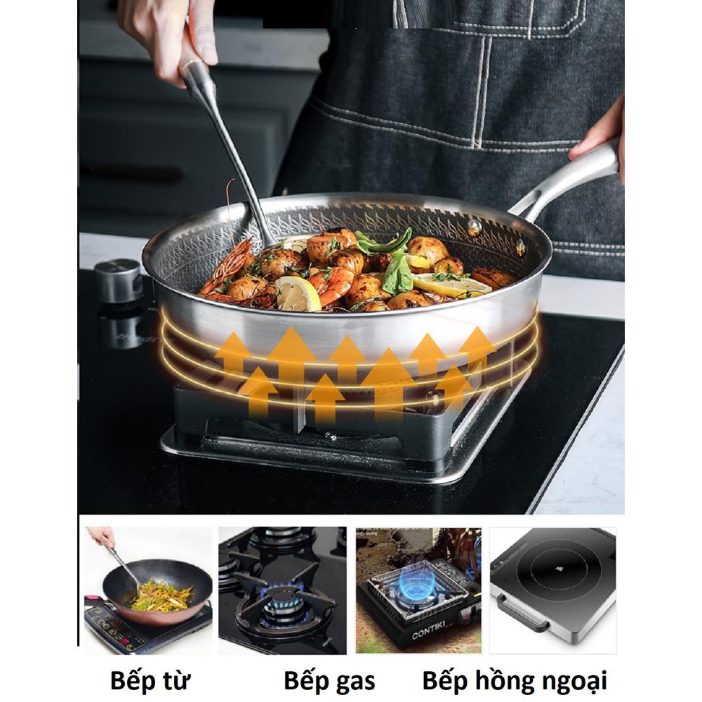 * Chảo từ sâu lòng chống dính nổi bật với Công nghệ mới - Lớp chống dính dạng Vân tổ ong:- Lớp chống dính ưu việt, có thể chế biến món áp chảo hoặc rán với lượng dầu mỡ tối thiểu.