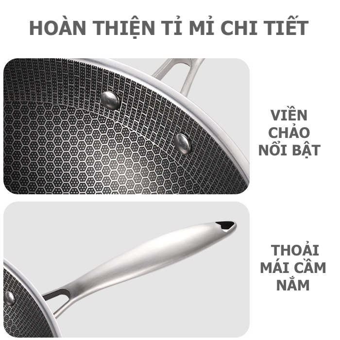 - Tay cầm bằng inox đúc rỗng, kỹ thuật đặc biệt ghép nối với thành chảo nên không nóng, nhẵn và sáng bóng nên dễ dàng rửa sạch và luôn đẹp, sang trọng.