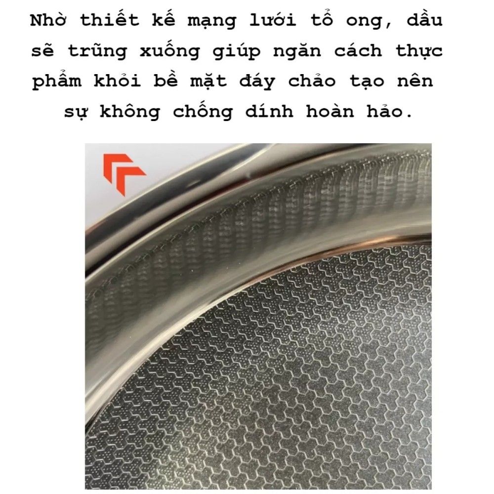 - Cấu trúc đáy đặc biệt dạng lưới tổ ong giúp chống dính đặc biệt, chống trầy xước, cho phép chiên ở nhiệt độ cao.