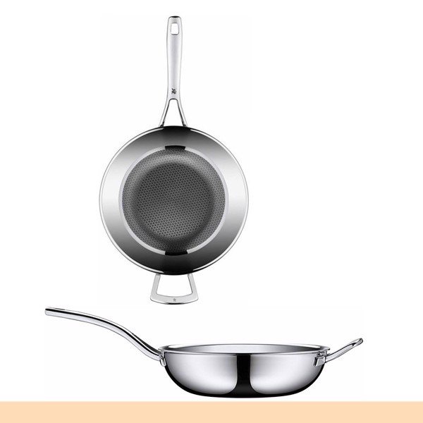 Chảo WMF Profi Resist Wok 28cm sâu lòng (tổ ong)Chảo WMF Profi Resist Wok 28cm sâu lòng (tổ ong) kết hợp các tính năng tốt nhất, chảo bằng thép không gỉ với đáy mạng lưới tổ ong: lõi nhôm, thép không gỉ cromargan và thép mạ crom cực bền bên trên mặt chảo. Nhờ thiết kế mạng lưới tổ ong, dầu sẽ trũng xuống giúp ngăn cách thực phẩm khỏi bề mặt đáy chảo tạo nên sự không chống dính hoàn hảo.