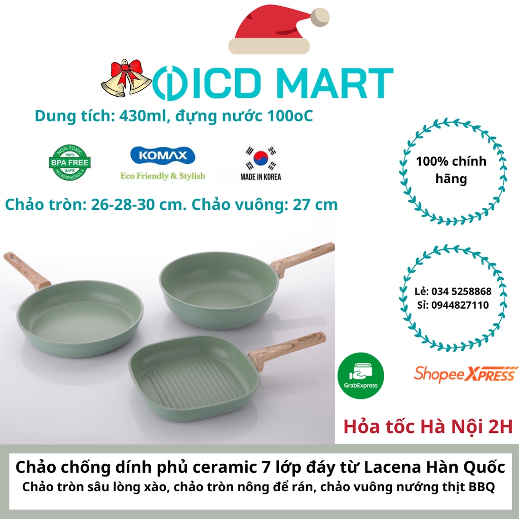 Chảo nhôm chống dính cao cấp Lacena Hàn Quốc xanh đá size 26cm, 28cm, 30cm Dùng được cả với bếp gas, bếp từ, hồng ngoại- Sản phẩm Chính hãng (nhập khẩu trực tiếp từ HÀN QUỐC)