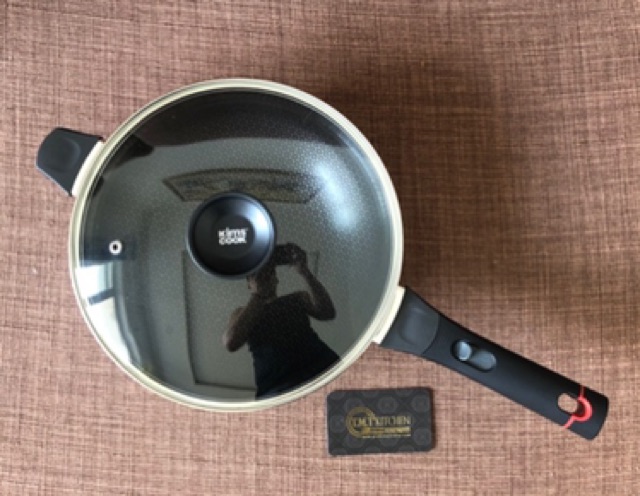 Vung giữ nhiệt cho chảo và thuỷ tinh chịu nhiệt giúp dễ quan sát thực phẩm trong khi nấu. Khe thoát hơi nằm cạnh vung.