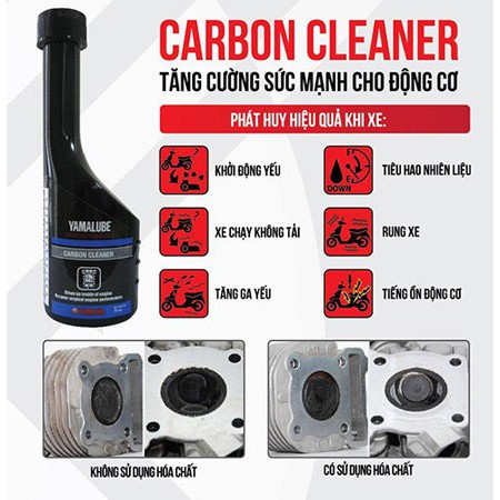 CARBON CLEANER - TĂNG CƯỜNG SỨC MẠNH CHO ĐỘNG CƠKhi sử dụng dung dịch Yamalube Carbon Cleaner, các-bu-ra-to, miệng kim phun, đường hút khí, su-páp và buồng đốt trong xe của bạn sẽ được làm sạch; khôi phục mức tiết kiệm nhiên liệu, công suất động cơ, trị số octane ban đầu. Khí xả (HC, CO, NOx) và lượng muội carbon bám ở su-páp, đầu buồng đốt giảm rõ rệt, giảm thiểu thậm chí loại bỏ các hiện tượng động cơ bị gõ (tiếng gõ carbon), khó dừng, dính su-páp, ì xe, giật cục, chạy ra-len-ti không đều... Bu-gi xe máy sẽ hạn chế tối đa cặn bẩn, bộ chế hòa, khí kim phun xăng, đường hút khí được làm sạch.