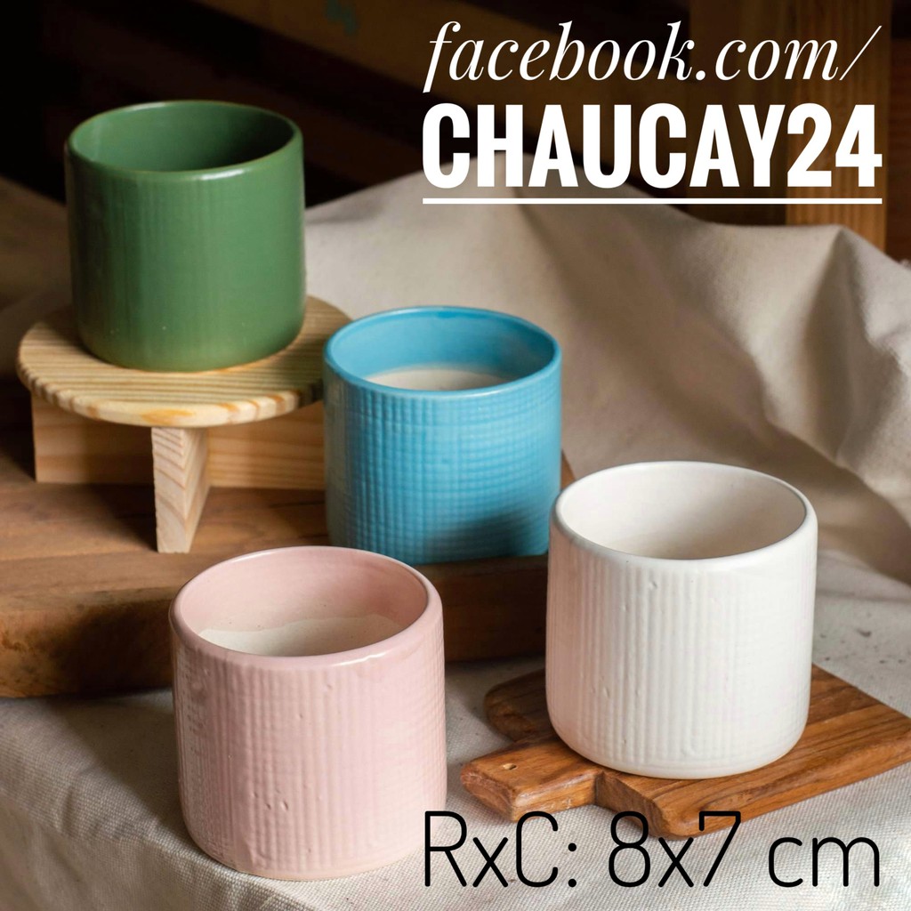 - Chậu được làm từ chất liệu men sứ, hình trụ kẻ, nhỏ gọn dễ thương, rất thích hợp để trồng các cây cảnh mini, cây sen đá, xương rồng, trang trí bàn làm việc, bàn học