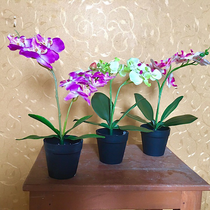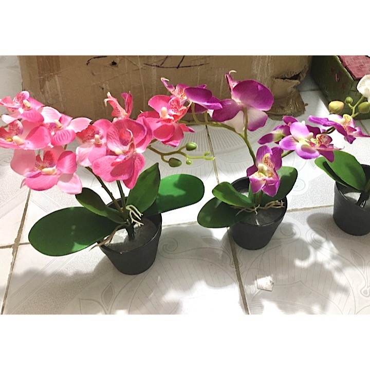 Chậu lan lụa để bàn , phòng tắm🚩Chất liệu: hoa vải lụa dày và cứng dáng hoa, lá xốp màu, thân nhựa