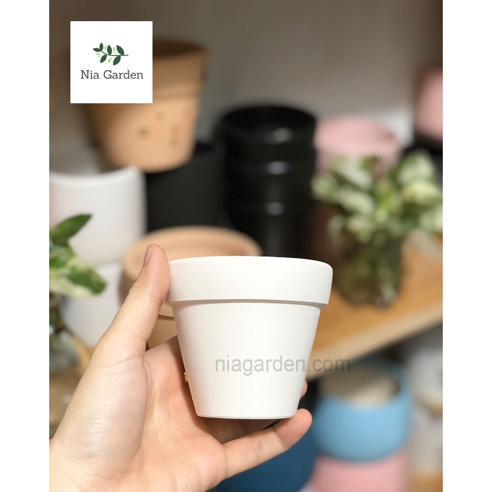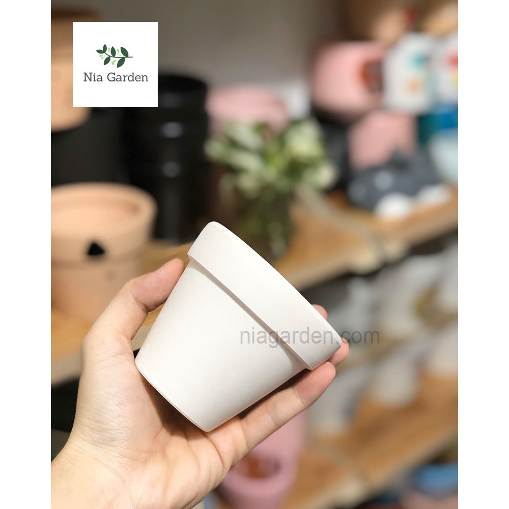 Chậu đất nung trồng sen đá xương rồng gờ cao trắng nhỏ mini Nia Garden N1