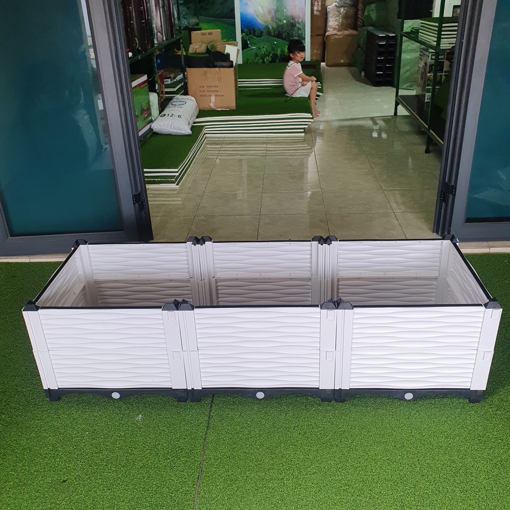 KÍCH THƯỚC: 50Cm (Rộng) x 150Cm (Dài) x 39Cm (Cao)Chậu ghép thông minh đang là giải pháp xu thế của đô thị, nó có kết cấu thực tế chắc chắn và đảm bảo cho bạn có thể trồng nhiều loại cây, đặc biệt với xu hướng trồng rau sạch đô thị thì nó đang là sản phẩm vượt trội khi có thể tháo rời vận chuyển đến những nơi chật hẹp, trên cao để tạo ra 1 mảnh vườn trên mái rộng theo ý muốn như dưới đất nền ko ảnh hưởng hay làm bẩn sàn của bạn.