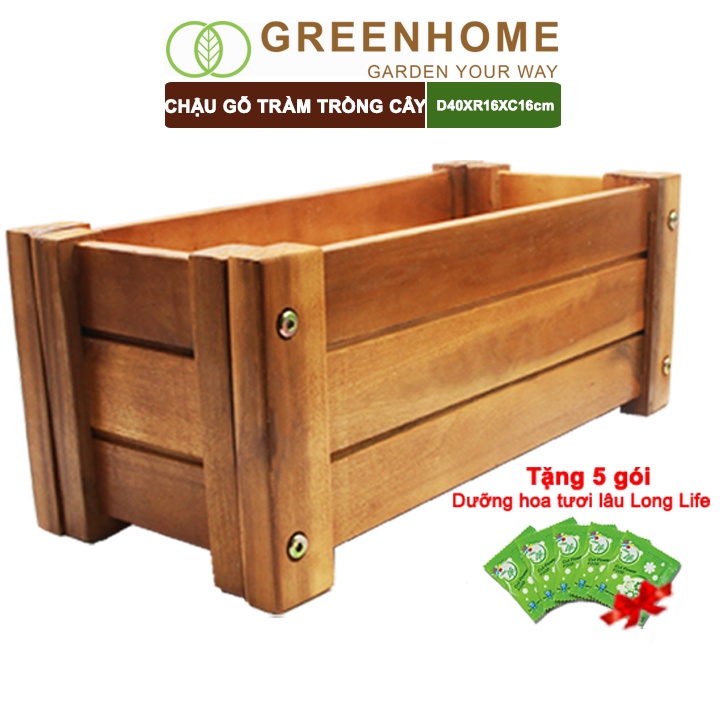 Nhà cửa & Đời sống > Làm vườn > Chậu cây || Chậu gỗ trồng cây, chữ nhật, D40xR16xC16cm, gỗ Tràm chịu nước, tặng 5 gói dưỡng hoa tươi lâu |GreenhomeCòn hàng
