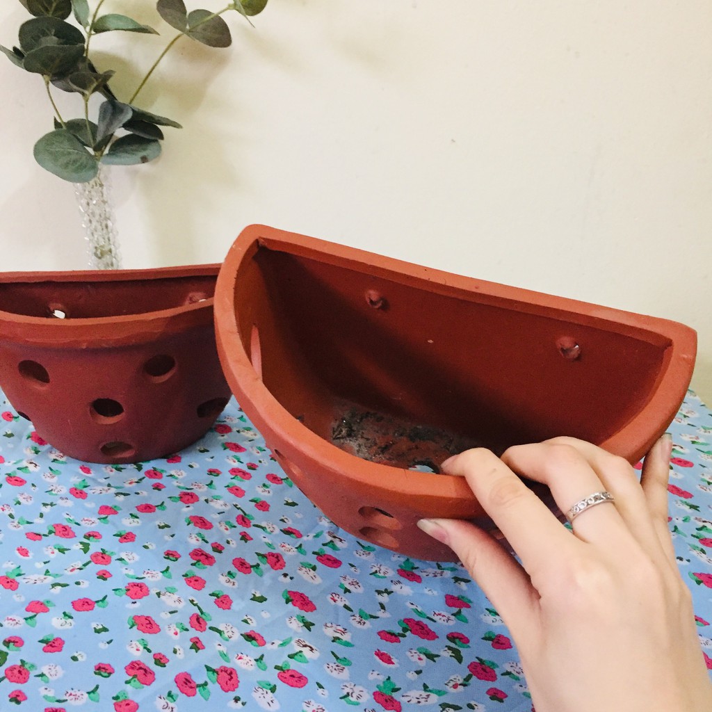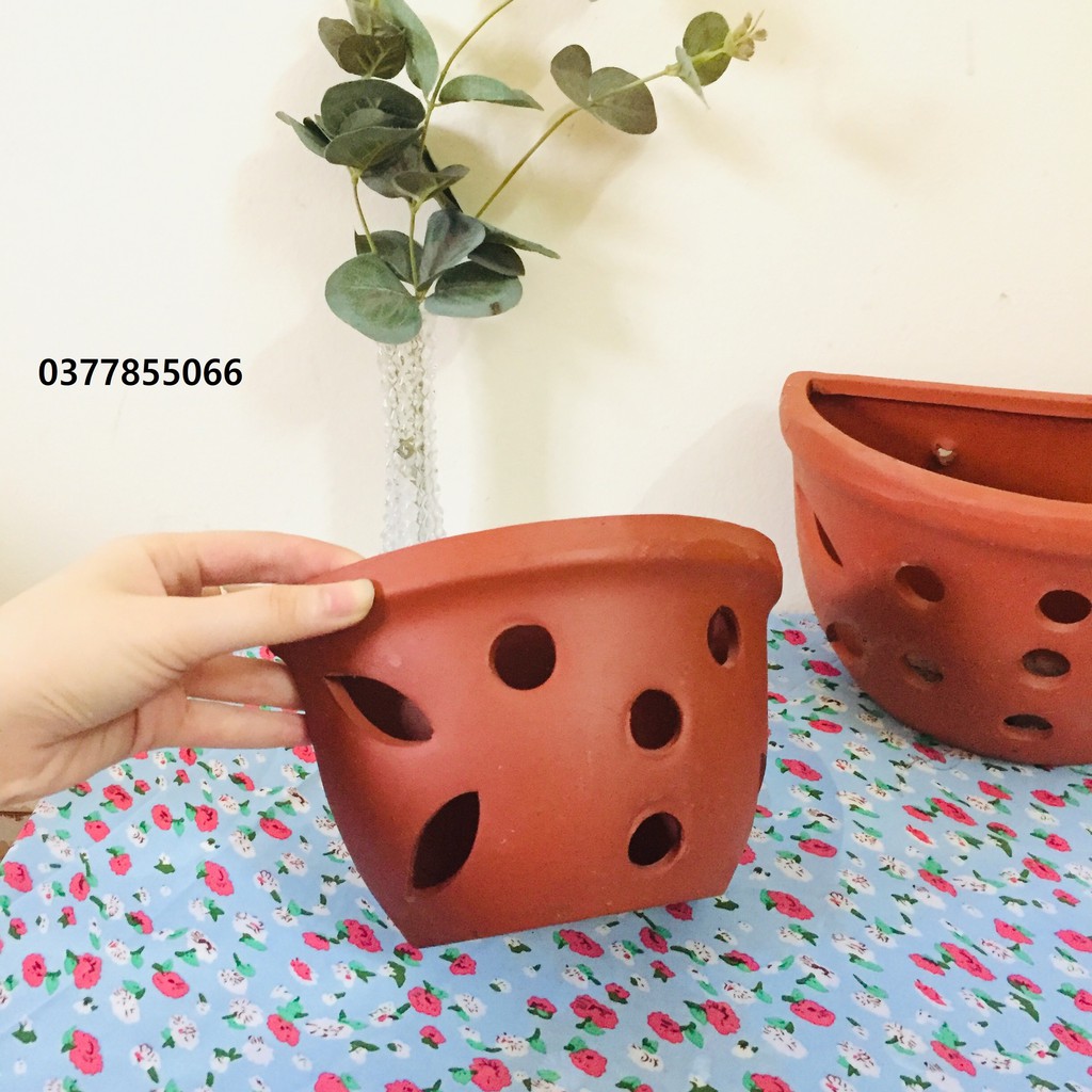 Chậu gốm sứ đất nung trồng cây trồng hoa treo tường, ốp tường trang trí, hình bán nguyệt, có lỗ thoát nước và lỗ treo- Mỗi chậu ốp tường đều được thiết kế theo hình bán nguyệt, nó sẽ có một mặt phẳng sau chậu hoa, bạn chỉ việc dùng đinh hay ốc vít ốp vào tường một cách dễ dàng và cân xứng. Sản phẩm phù hợp với treo tường, lan can và hàng rào.
