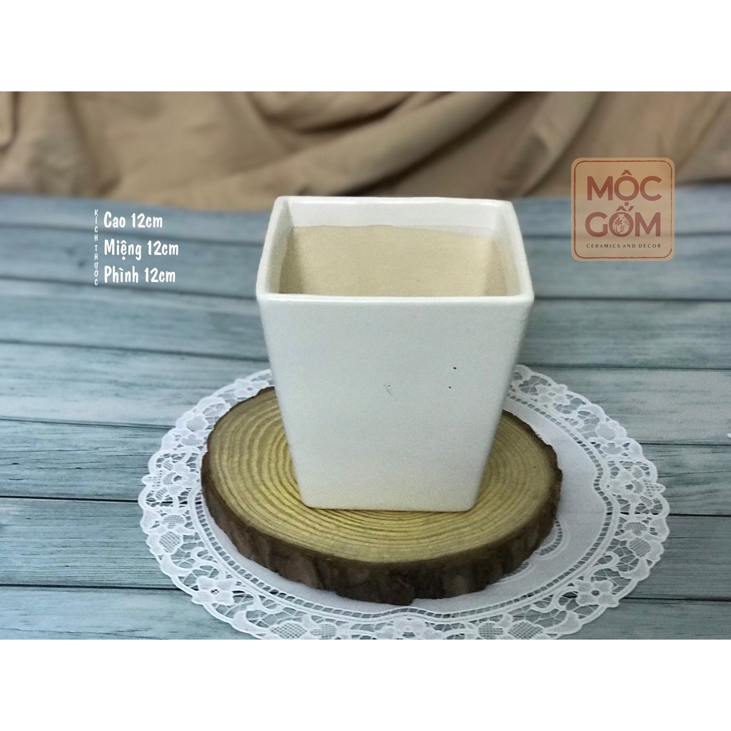 Chậu gốm trồng cây Bát Tràng đáy có lỗ men trắng - Mộc Gốm