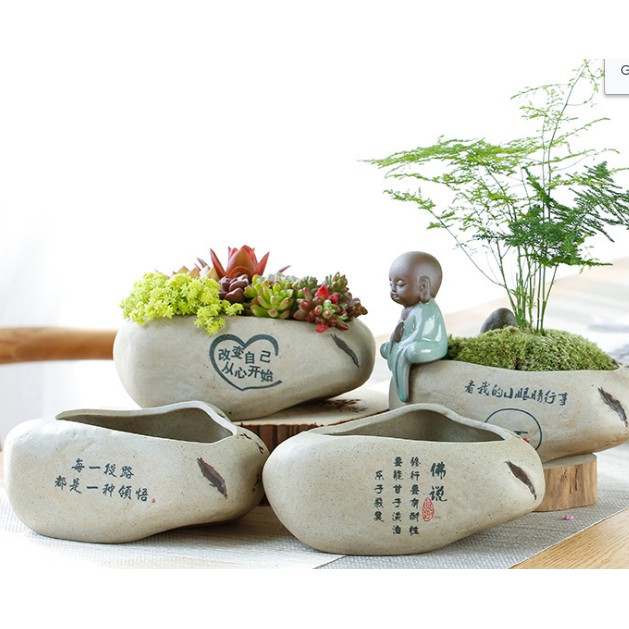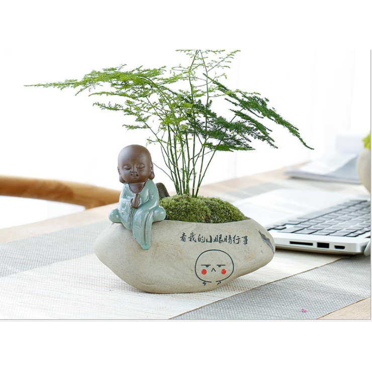 Chậu phù hợp với trồng cây dạng bon sai mini hoặc làm tiểu cảnh mini trang trí. Có thể trang trí tượng chú tiểu tao nhã, yên tịnh rất phù hợp với những người chơi và yêu cây.