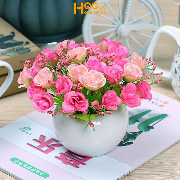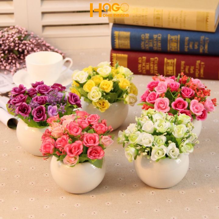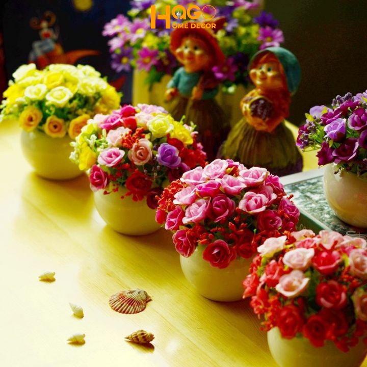 Giới thiệu Chậu hoa giả, chậu hoa mini kích thước cao 12-15cm cm cắm sẵn nhiều mẫu hoa