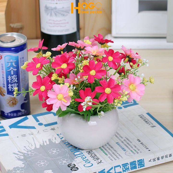 Chậu hoa giả, chậu hoa mini kích thước cao 12-15cm cm cắm sẵn nhiều mẫu hoa