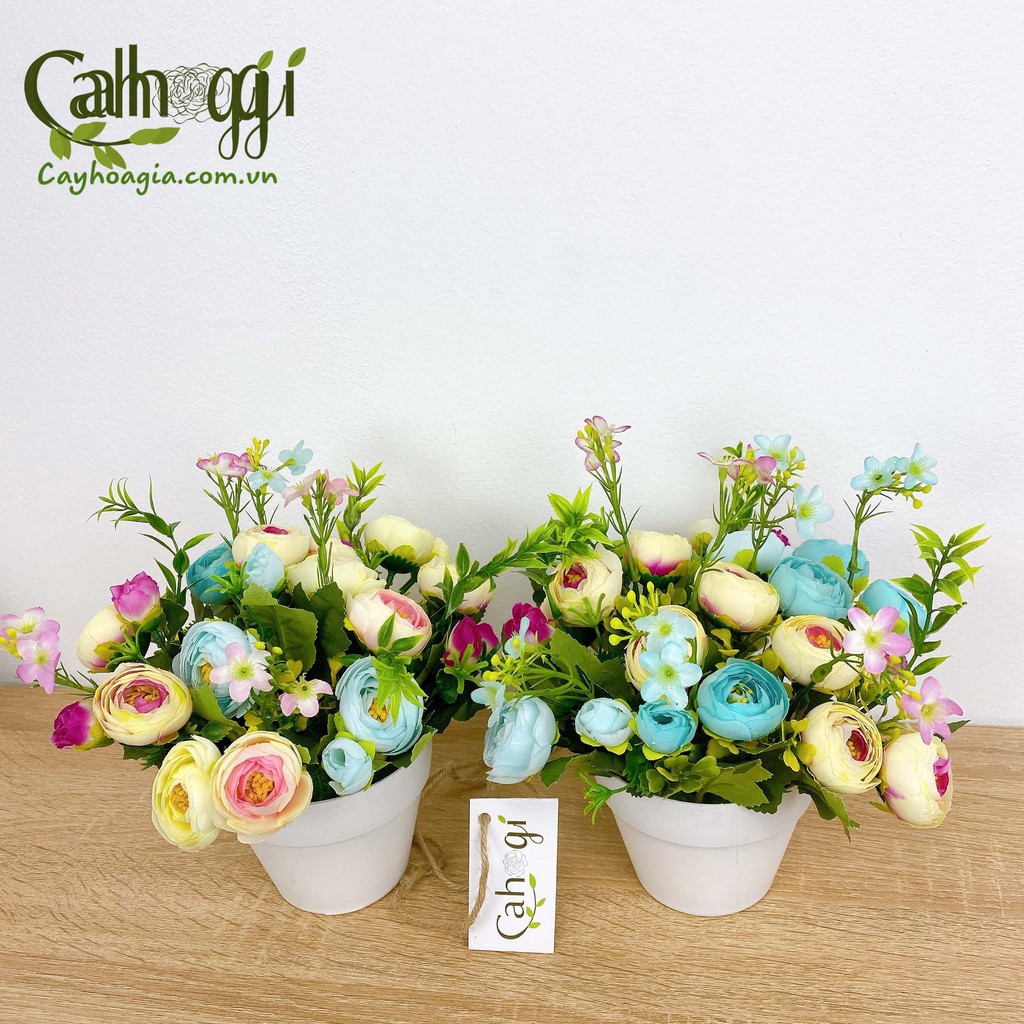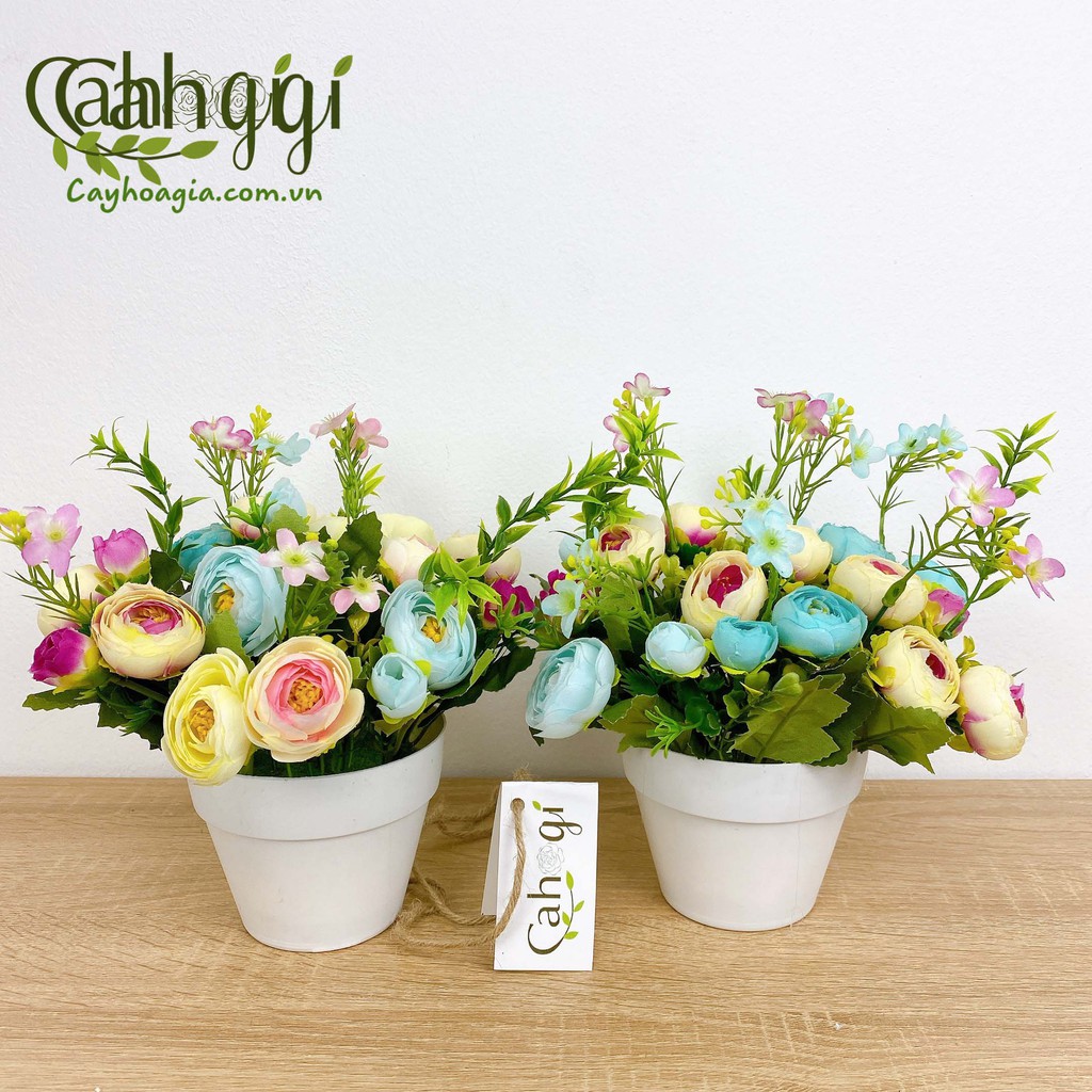 Chất liệu chậu bằng nhựa, hoa và lá bằng vải. một vài ngọn mầm bằng nhựa. cuống lõi thép bọc nhựa