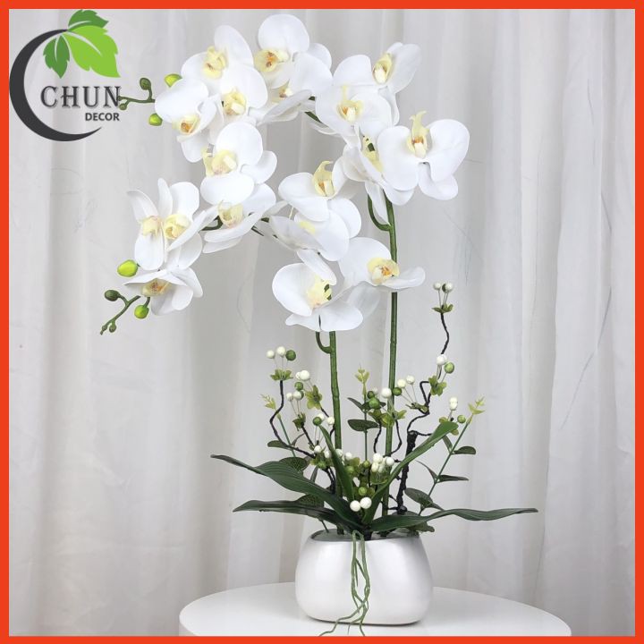 - Chất liệu: chậu hoa gốm sứ, hoa lan hồ điệp cao su cao cấp, cành nhựa bọc thép dễ dàng uốn tạo dáng