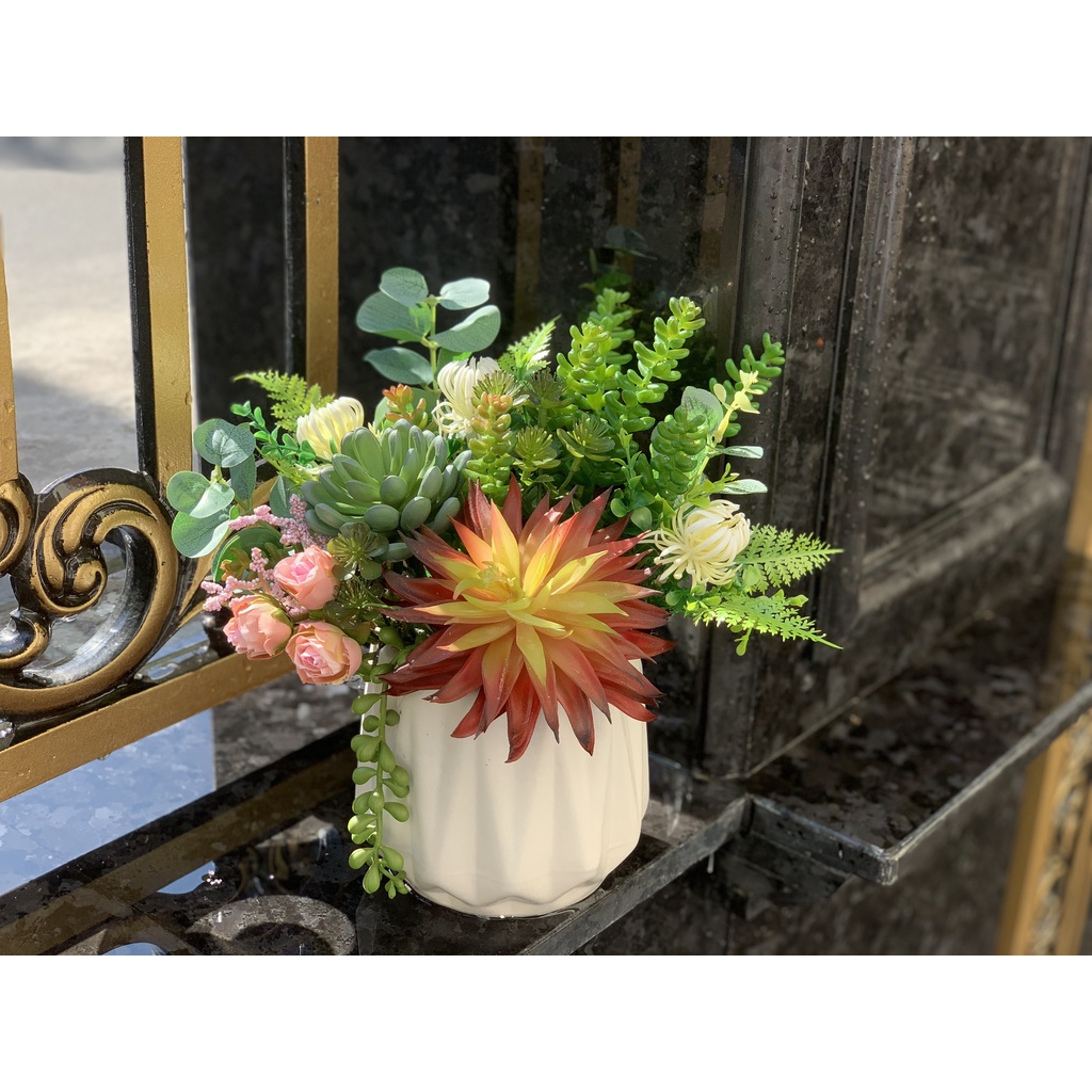 - Chất liệu hoa nhựa và cao su non bền màu với thời gian, hơn nữa hoa đá được cắm vào những mẫu bình gốm xuất khẩu nên càng tôn nên vẻ đẹp của cả bình hoa... Chẳng cần tưới tắm mà lúc nào cũng xanh tươi như thế này đây ạ!