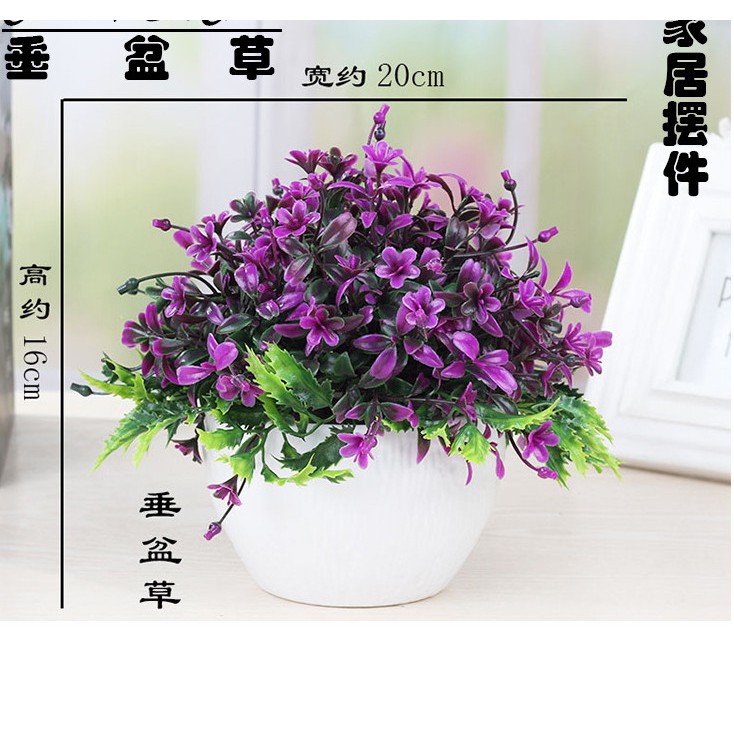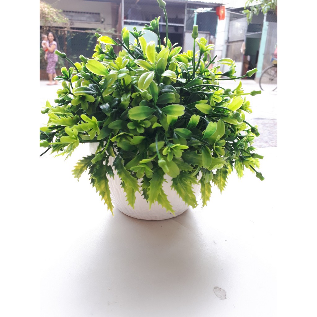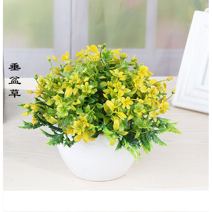 ** Chất liệu: chậu nhựa, hoa cỏ và lá nhựa