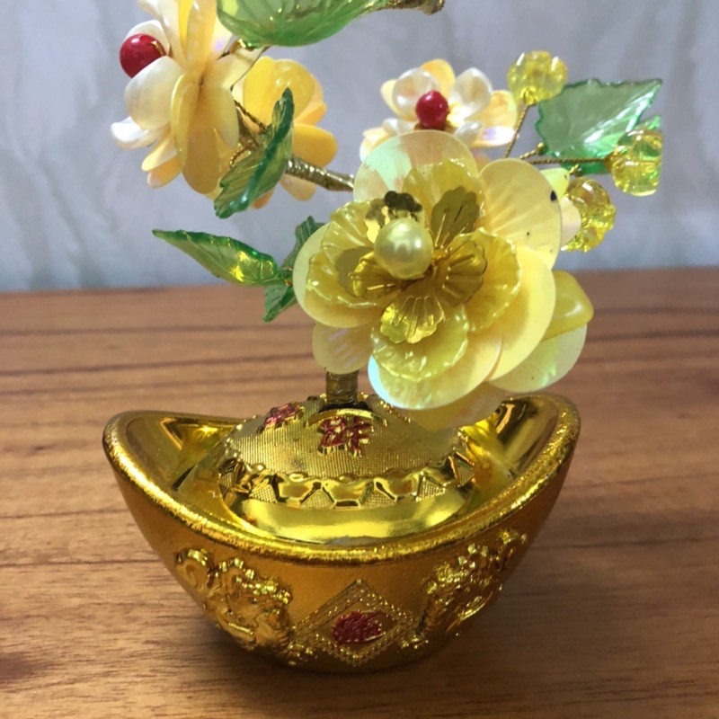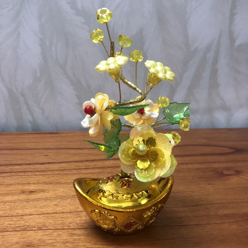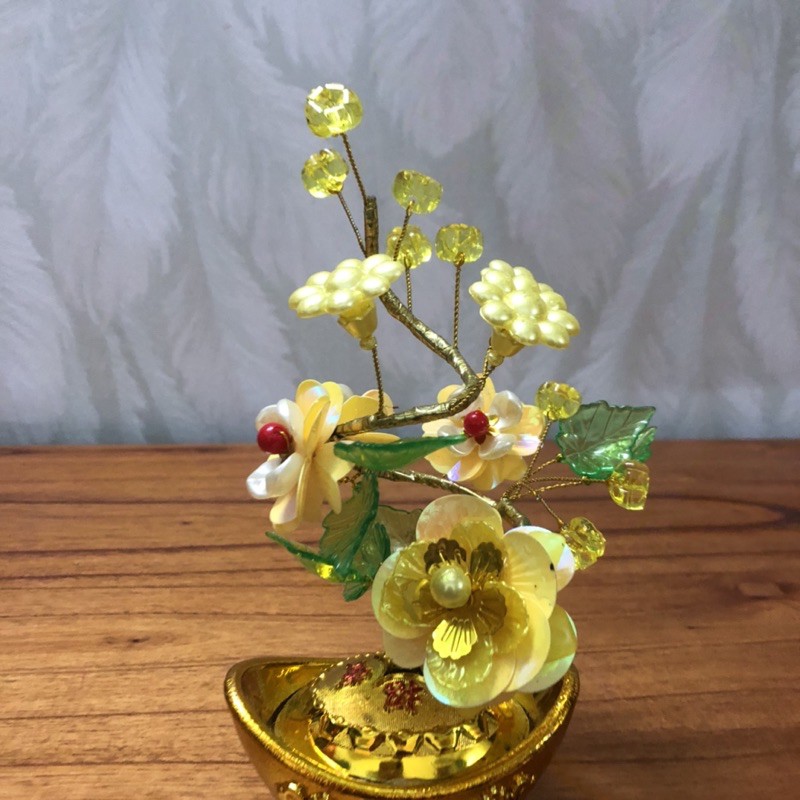 Giới thiệu Chậu hoa mai vàng kết tay từ cườm và pha lê nhựa bình hoa để bàn