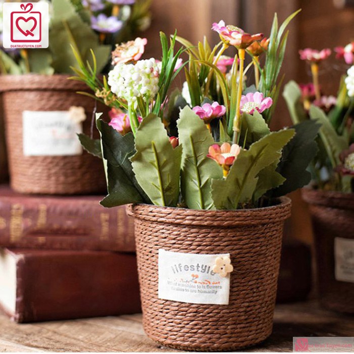 Chậu hoa mây cuộn dây thừng trang trí phong cách vintage để bàn, kệ trang trí