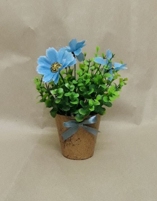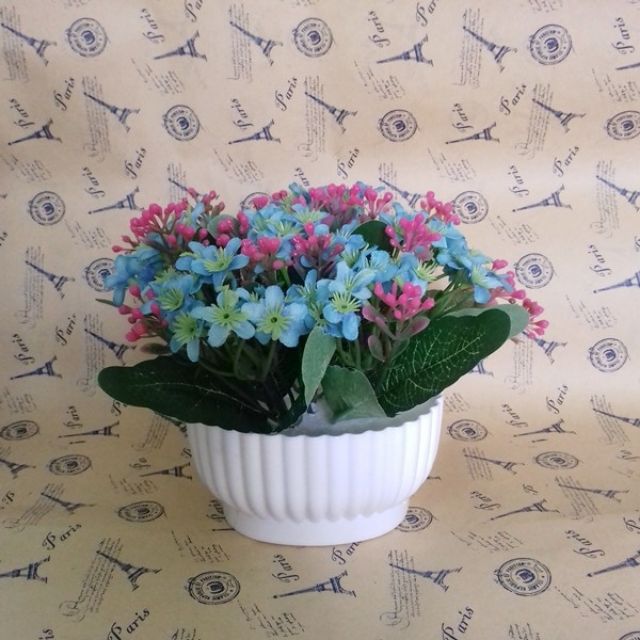 Chậu hoa giả nhỏ xinh bày trang trí bàn học, bàn làm việc, giá kệ trang trí cho bạn cảm giác thư thái, nhẹ nhàng.Những bông hoa tươi sắc nổi bật trên những cánh lá xanh.