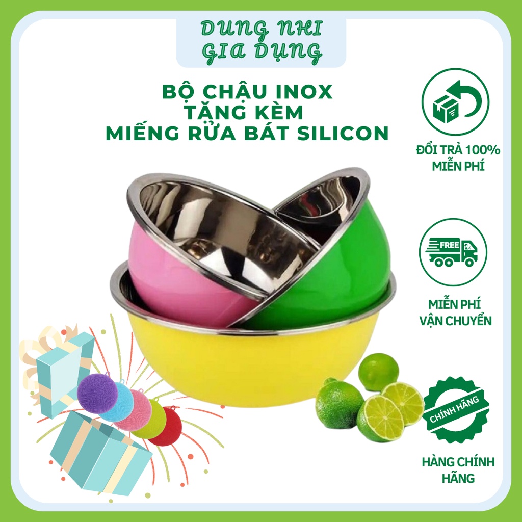 Bộ Chậu Inox 3 Món Màu Siêu Bền Set 3 Món Thau Inox Nhiều Mau Tặng Kèm Miếng Rửa Bát Silicon EcoHome
