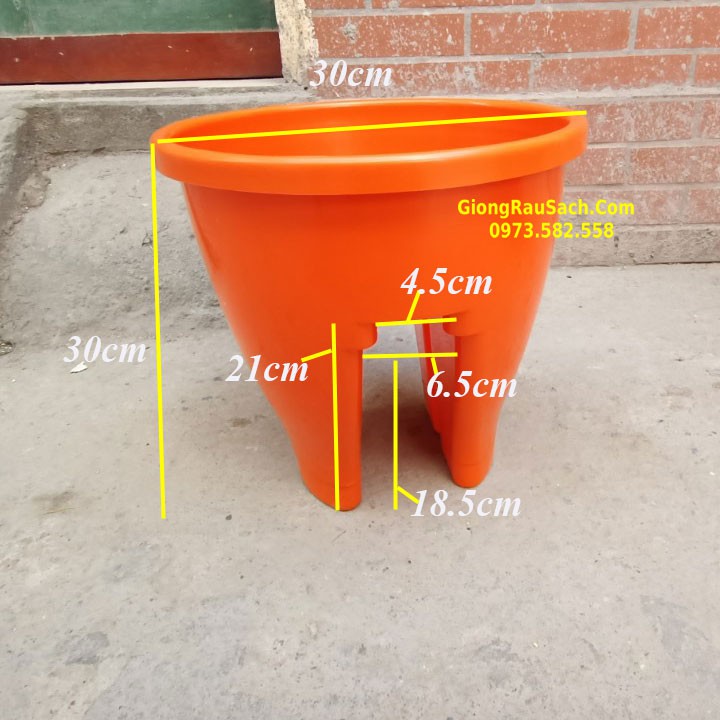 - Kích thước: Đường kính chậu 30cm, chiều cao chậu 30cm; độ rộng giữa 2 chân: 4.5-6cm