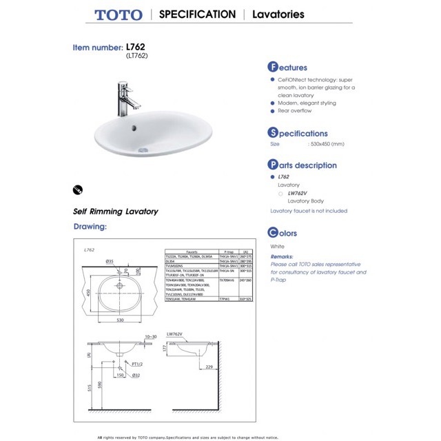 Đặc tính kĩ thuật chậu dương vành ToTo L762(LT762)