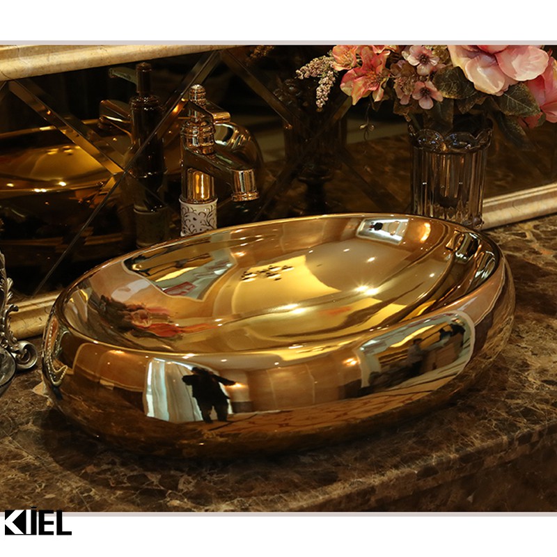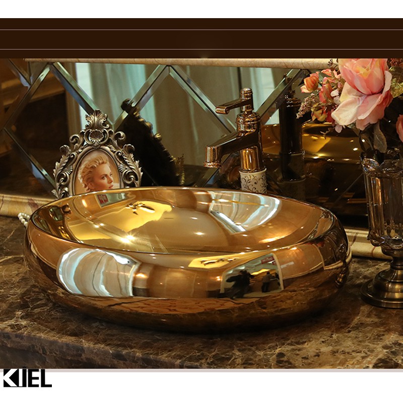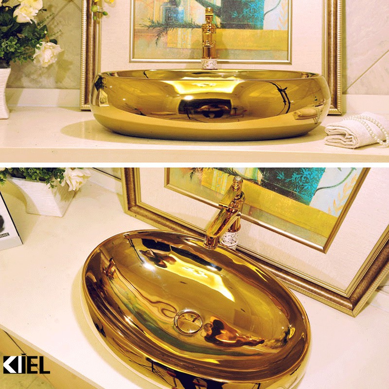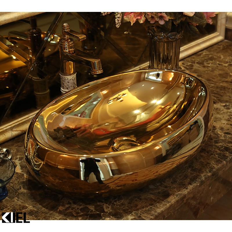 Chậu lavabo elip mạ vàng , chậu rửa mặt hàng chính hãng bảo hành 10 năm chất men .