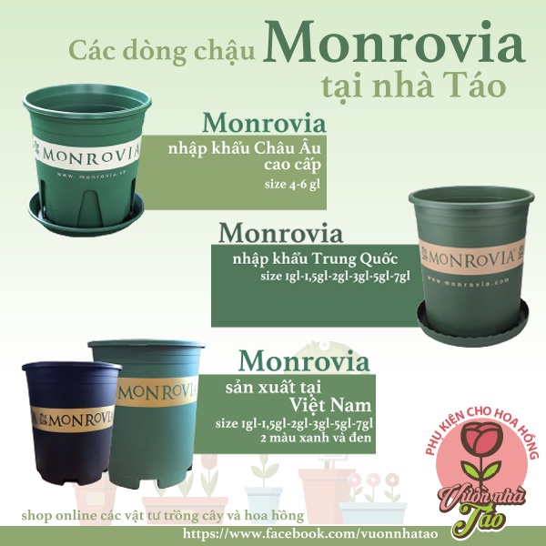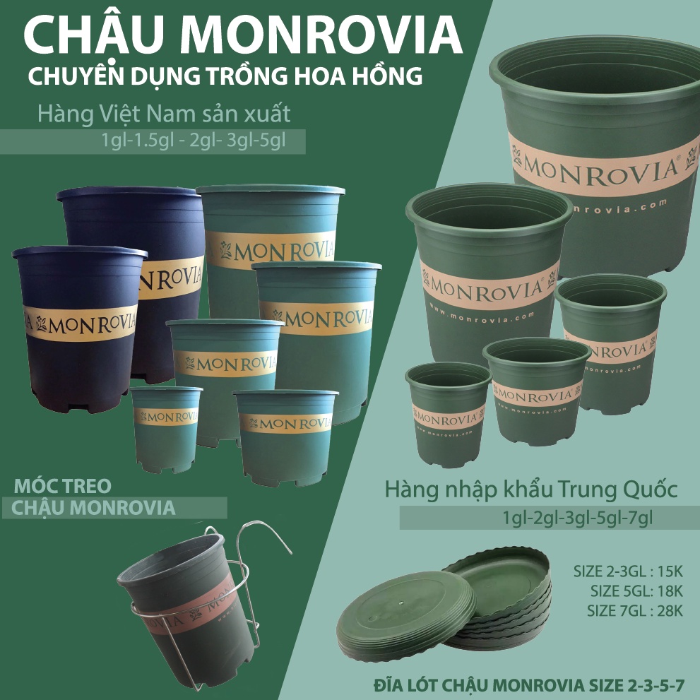 ** Khách lưu ý chậu Monrovia loại hàng Việt Nam sản xuất không có đĩa lót, khách có thể order thêm đĩa lót riêng của loại nhập TQ.