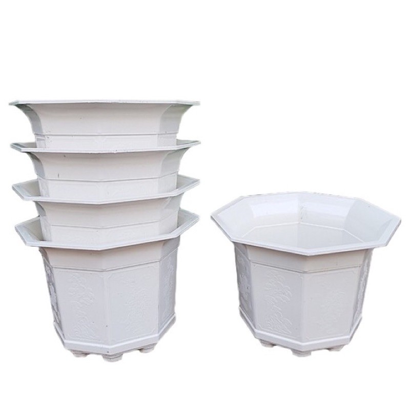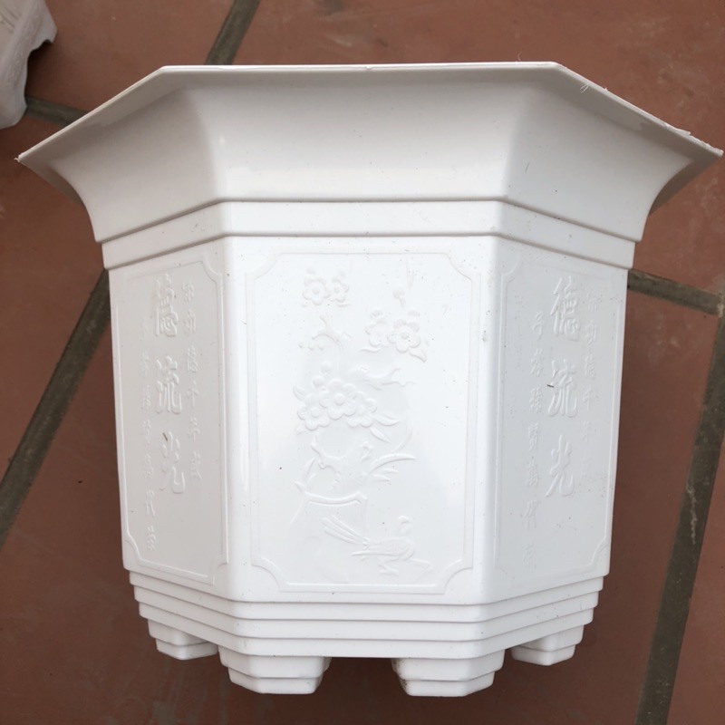 Chậu nhựa Bát giác trắng 30x22cm khắc nổi hoa văn rồng phượng, tùng bách, mai, lan.. dày loại 1 hàng công ty VN• Kích thước: đường kính miệng 30cm – cao 22cm